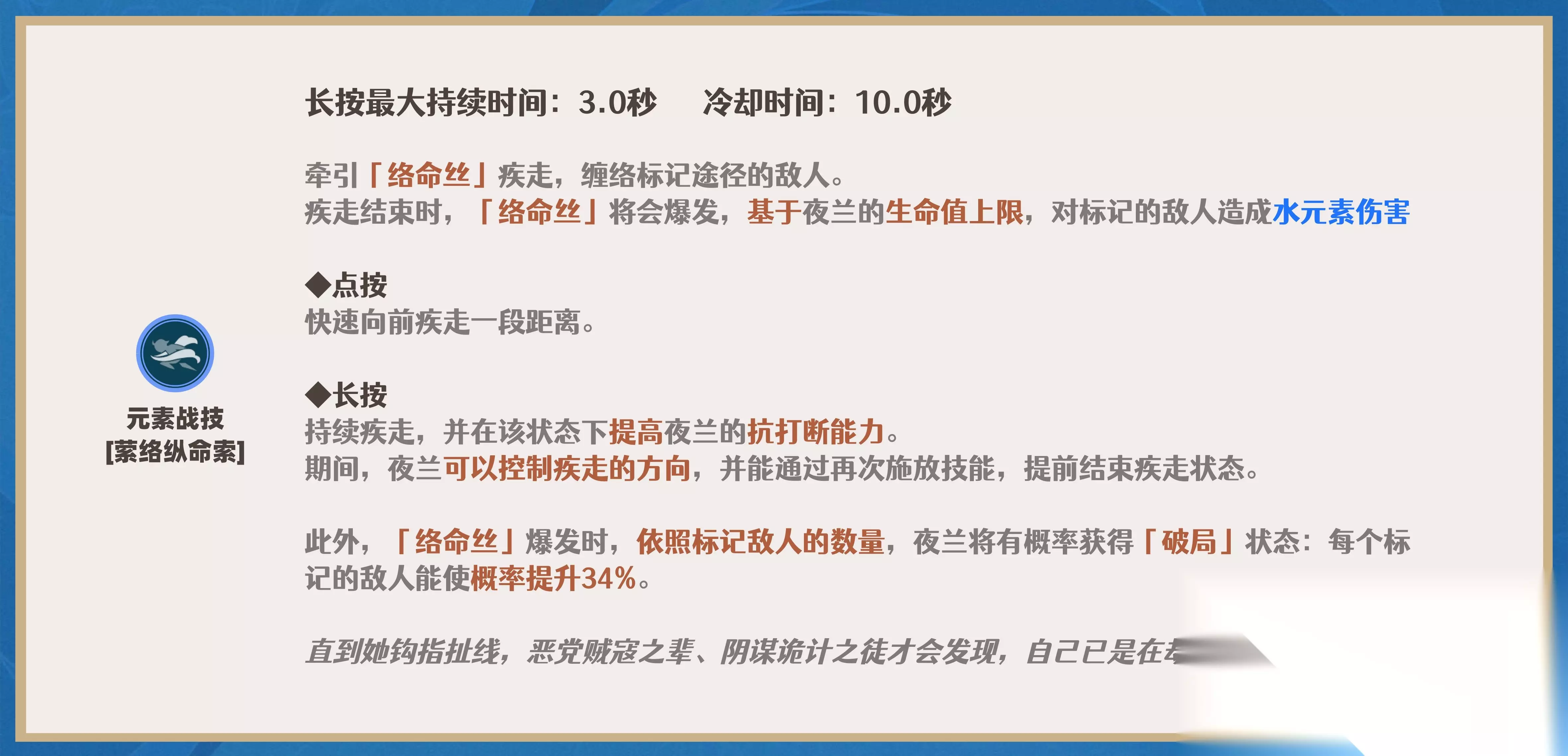 ①.长按战技进入持续疾走状态,该状态下将提升夜兰的移动速度,此状态不影响体力恢复,在大世界跑图中有着极为优秀的体验,利用该特点可选择冲刺奔跑和夜兰长按战技穿插跑图的作用。 ②.持续疾走状态下(长按),可以无视部分敌人碰撞体积(即穿过敌人),诸如史莱姆、丘丘人、愚人众等等敌人。 ③.「络命丝」攻击为弱水元素附着,每次命中均可施加元素附着。 ④.每次点按/长按战技命中敌人后均产生4颗水元素微粒。 【3】元素爆发(Q)