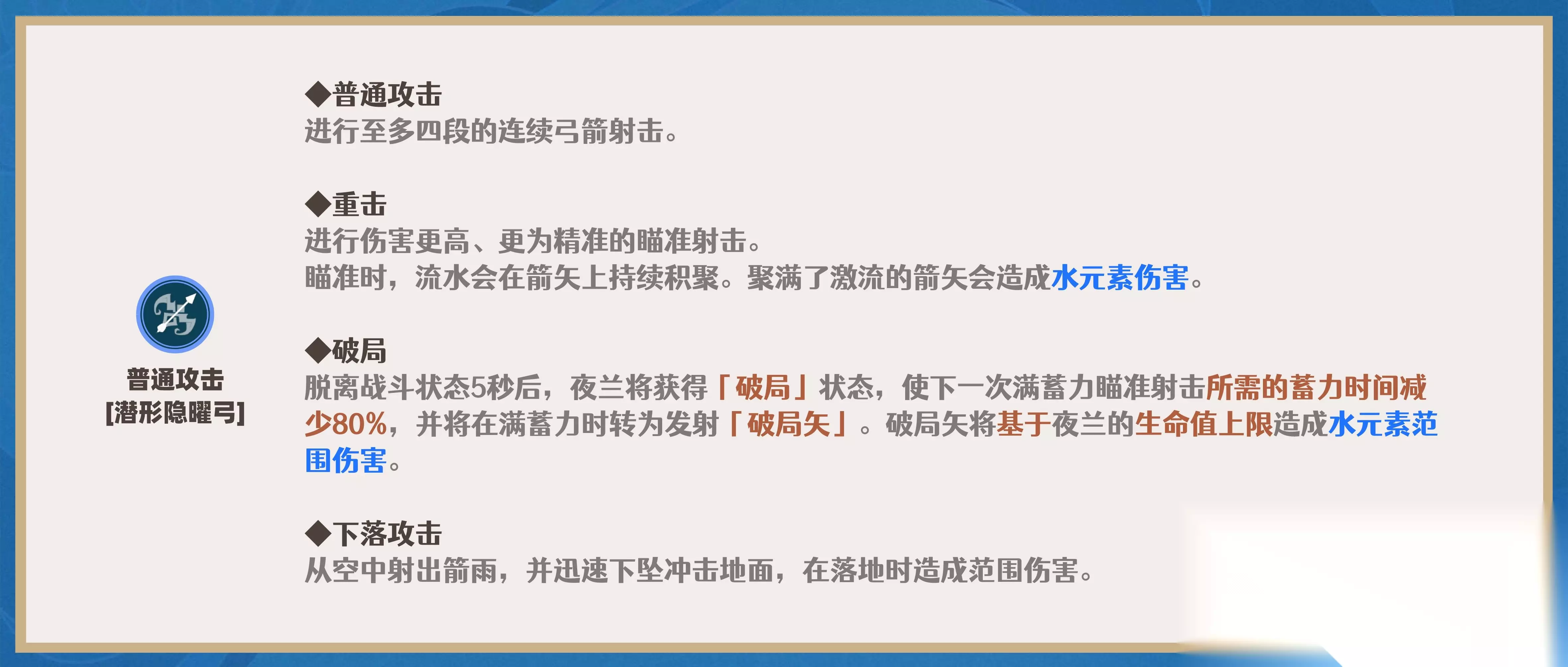 原神全角色天赋加点推荐2024 ①.普攻分为4段,共5次伤害,第4段攻击造成2次伤害且具有较大动作后摇,其余段数均造成1次伤害。 ②.蓄力射箭(重击)、「破局矢」(包含6命效果)均为弱水元素附着(1元素量、9.5秒)。 【2】元素战技(E)
