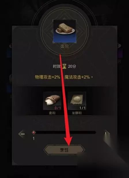 先说面包,该菜品属于蓝色品质的食物,它的制作方式很简单,只要有麦粉和发酵粉就可以做出来了。两种原材料都是可以通过打怪获得的,而打怪是概率掉落的,要想在短时间内获得足够的材料需要直接购买,拿齐材料后将他们一起放在烤炉里面就能做出面包了。注意面包是可以给怪物凯拉使用的,凯拉吃完面包后将会解锁新的剧情,玩家自己用的话可以在战斗开始前使用,使用过后会为玩家提供增伤效果,所以平常可多做些备用。