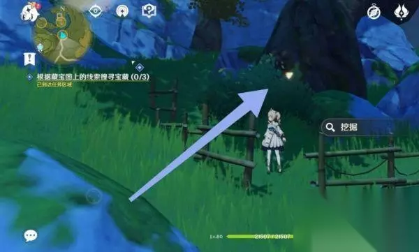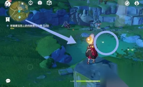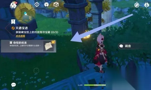 3、我们打开背包,来到藏宝图的位置。然后来到小树丛,经过调查获得了纸条;
