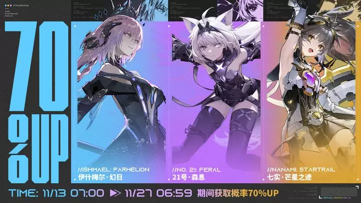 “降临狙击”“命运降临狙击”研发池更新,11月13日将迎来泛用机体「伊什梅尔·幻日」「七实·芒星之迹」「21号·森息」的获得概率UP活动!具体如下:
