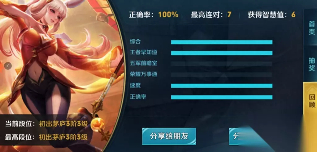 钟无艳-沙滩丽影的大锤子上画着什么? 答案:鲨鱼 在背景故事中公孙离是什么种族? 答案:B、魔种 作为混血魔种的公孙离拥有那种动物的耳朵? 答案:兔子 王昭君凤凰于飞皮肤中一技能的特效是什么颜色? 答案:橘色 王者荣耀五军对决哪个野怪有伤害buff 答案:魔道之玉野怪 以下中立生物不属于五军之战的是 答案:主宰先锋 诸葛亮黑板后面 xx祝你中秋快乐的xx是? 答案、甄姬 孙悟空西部大嫖客皮肤上正面挂的东西是什么? 答案:辣椒 如果对面控制技能较多时,公孙离应该带哪一个召唤师技能来提高生存能力? 答案:净化 下列英雄中适合与公孙离走同一条路的是? 答案:明世隐 烛龙建立的猎妖师组织叫什么? 答案:神秘组织墟 以下五军对决快速获取发育的手段错误的是: 答案:清理并线 五军对决中玩家最多可以获得几连击破: 答案:8 五军对决里的五军不包括下面哪个? 答案:南蛮 以下哪种方式是S10赛季皮肤的获取方式? 答案:黄金排位及以上排位胜利10场 新版本的主题下面哪座城市有关? 答案:长安 一场五军对决一共有多少支队伍同场竞技? 答案:5 李白凤求凰为哪个生肖年的限定皮肤? 答案:鸡 请问铠和露娜是什么关系? 答案:兄妹 随新版本更新的峡谷地图是什么主题的? 答案:新春主题