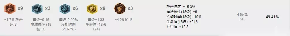 这套符文的核心就是高双抗+高攻速,双抗的使用自然没有太大的疑问,可以攻速很多玩家会觉得没有必要。就像天赋中也选择点出了攻速一样,因为慎的主要消耗和进攻手段伤害来源为Q,而Q只能靠普攻打出,本身就不会出攻速装血的慎,对于攻速的需求就只能从天赋和符文入手,所以如果想对线和团战打得更有压制力,攻速的使用还是很有必要的。 天赋