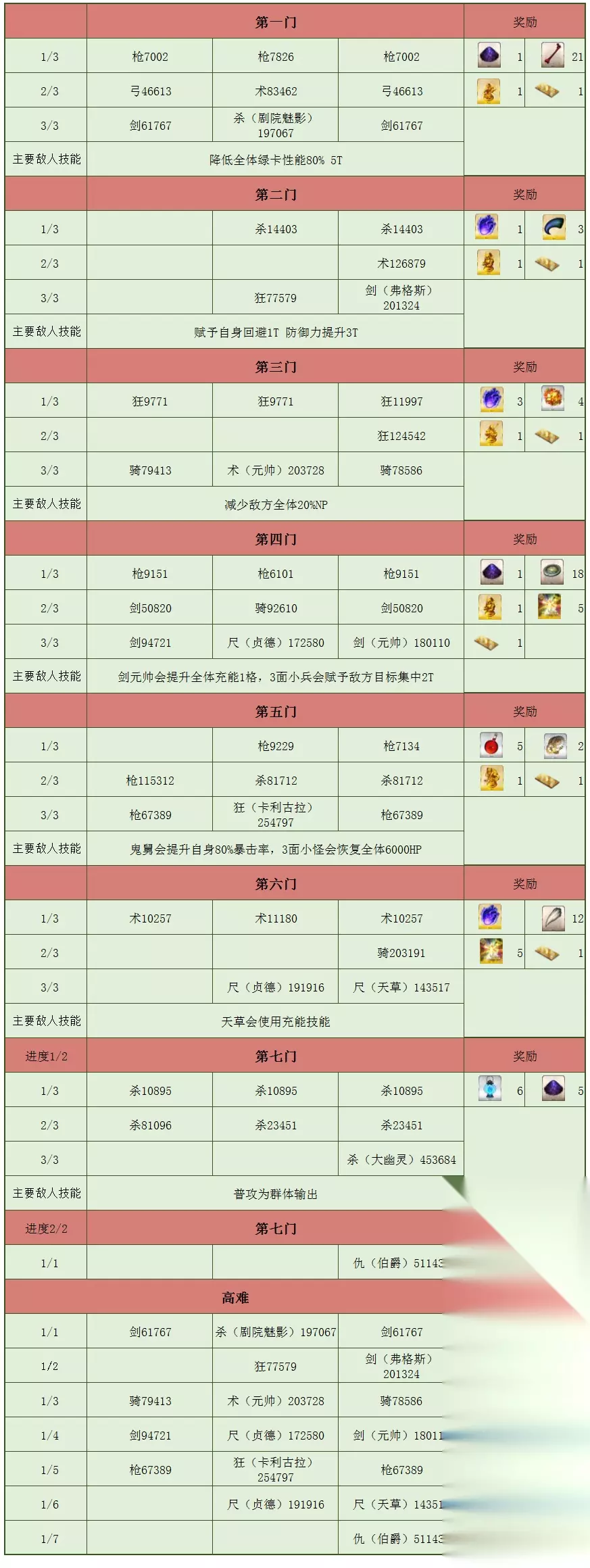 以上为监狱塔所有副本的关卡配置及通关奖励,除了素材之外,稀有奖励包括9个呼符和1个传承结晶,还是非常香的,用5个金方块来兑换还是蛮划算的。 9个呼符接近一次十连,比起兑换梦火来说,稍贵一点,但是多了一个结晶,所以也还可以,加上这一个十连可以迅速获取,要比刷羁绊容易得多,个人还是比较推荐的。 下面简单说一下每关的通关思路,虽然在早期算是高难度活动,但是随着后期从者的充实,也变得没那么难了。 到第七门的第一关之前,所有的助战都是锁伯爵,伯爵为90级4宝,技能662,无礼装,可以使用伯爵当输出也可以自己使用输出。