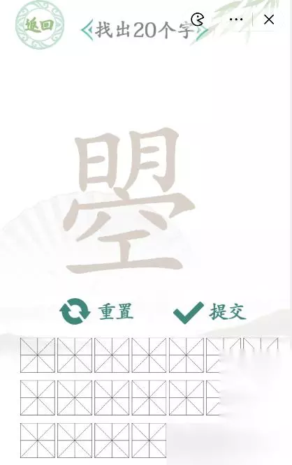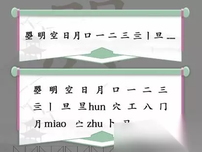 2、找字类的关卡我们已经做过好几个了,这里直接给出答案如下图所示: 一、二、三、亖、日、月、空、丨、工、明、穴、冂、曌、口、八、卜、旦、㝉、月