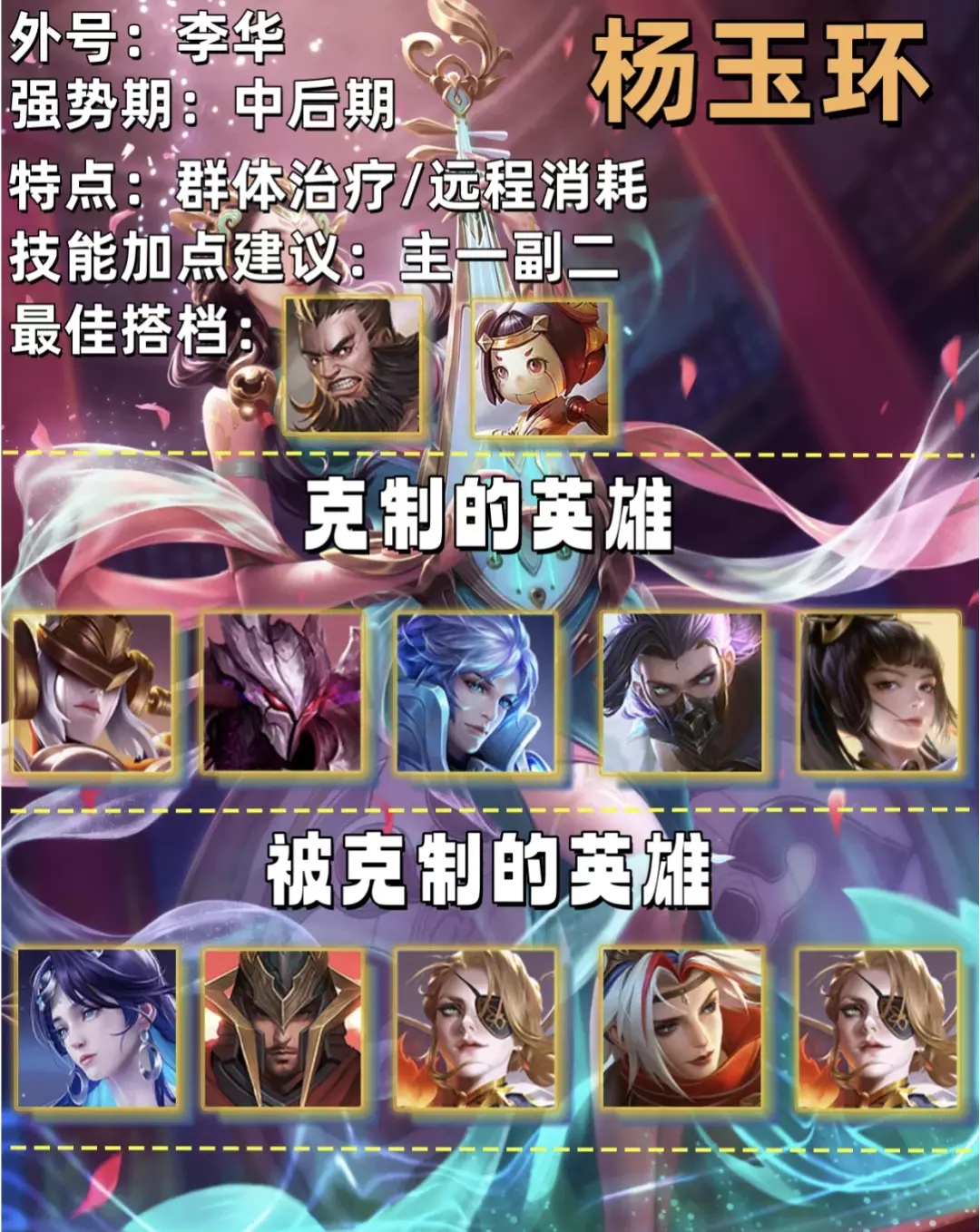 杨玉环是一个可中、可野、可辅的法伤英雄。玩儿好杨玉环最重要的就是要学会拉扯。