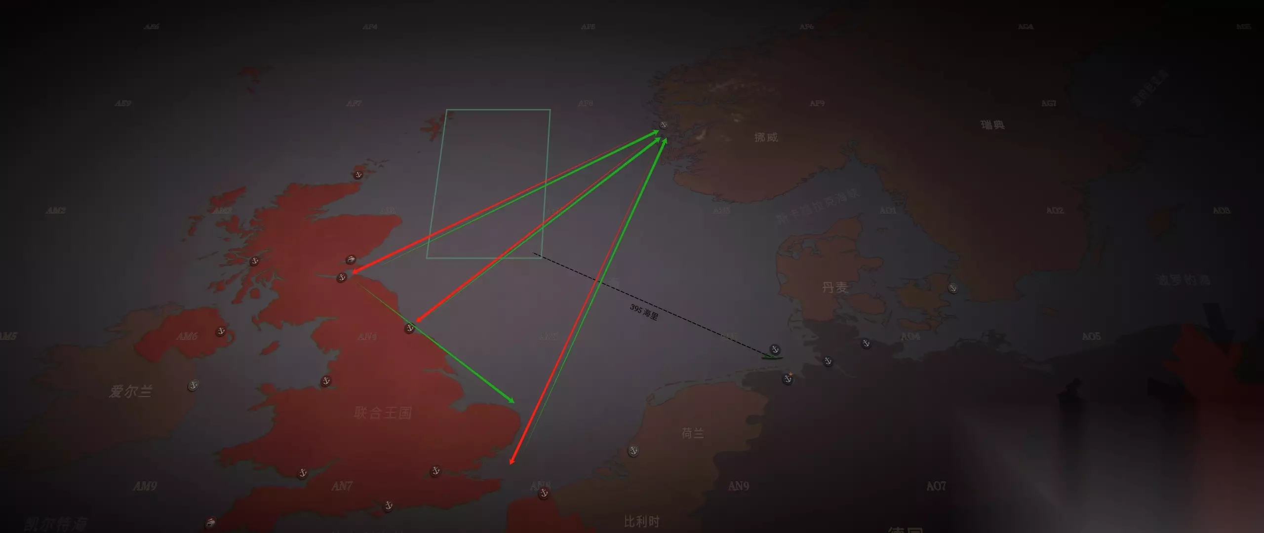 UBOAT游戏开始时有什么航线 首先开战的英国,首次巡航时我们大概率会遇到英国,挪威两个国家的商船,箭头标注的是他们的贸易航线,在这附近,大概率是可以侦测到单独往来的船只的(尤其是最下面的航线,英国商船居多,中间挪威商船居多,最上面的线有极大概率侦测到的会是多艘船只,游戏开始于1939年,多船并行基本可以断定是英国海军舰队,可以打,但是没意义,极不建议在北边巡航侦测)