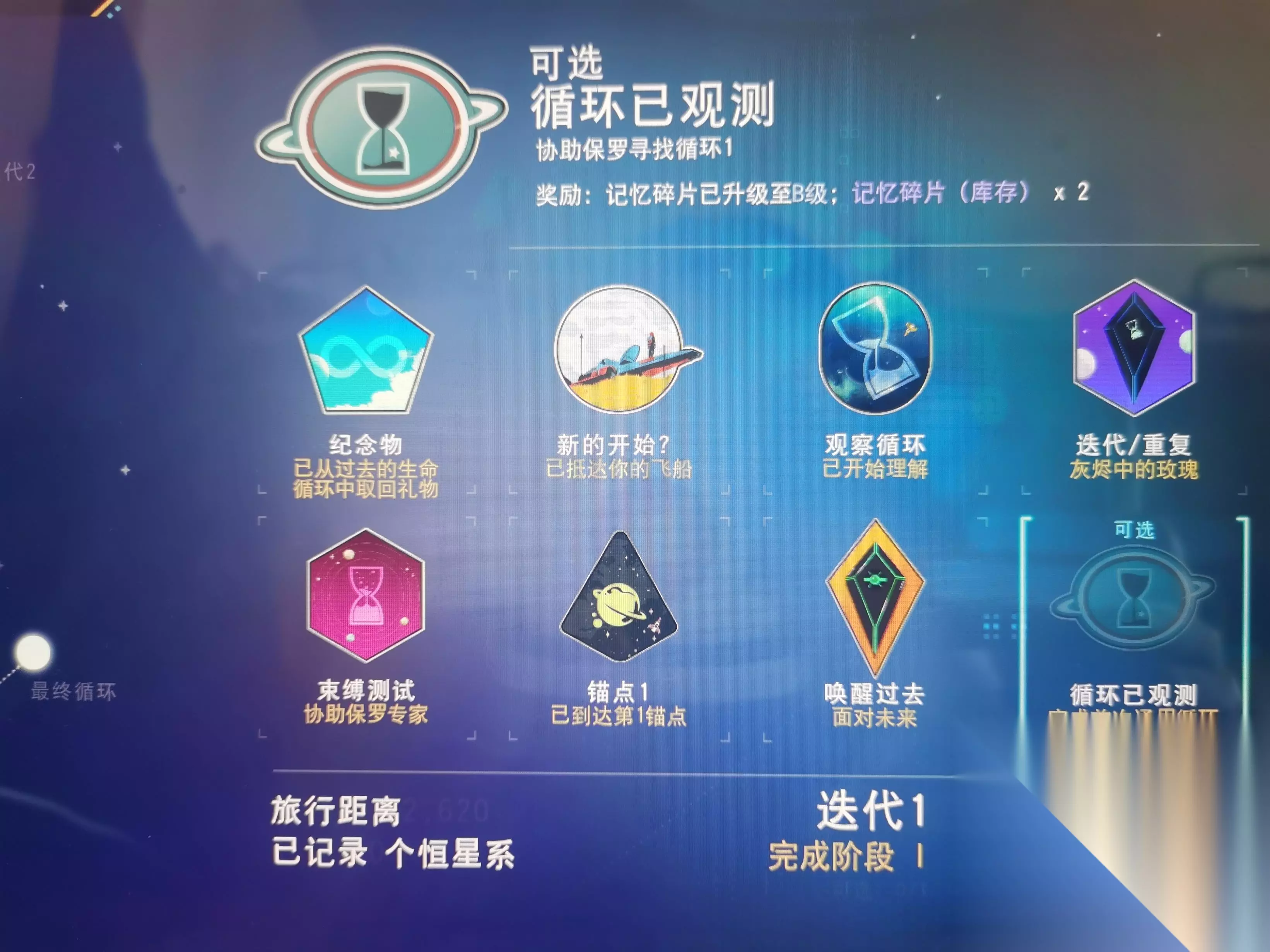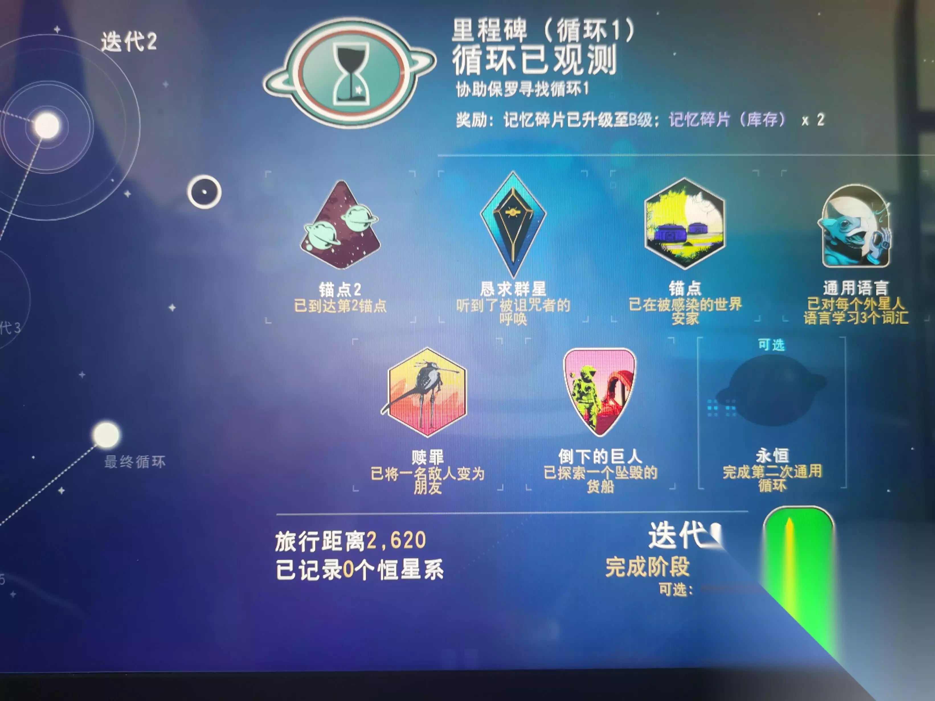 阶段一本次远征五个阶段都有一个可选任务,根据我的推测,那个应该跟社区任务总进度挂钩的,也就是说要所有玩家都去给保罗交材料才会慢慢涨进度,所以不用担心做不了的问题,时间久了应该就会满进度。 首先,进入远征后,第一件事就是找个法子弄死自己一次(比如飞高点摔死) 死亡一次后完成任务《迭代/重复》,获得密封剂和基地电脑图纸。 重生后打开背包应该会有记忆碎片之类能使用的东西,使用后完成任务《纪念物》 在地面上发育发育,还是老一套的修理飞船,靠近飞船后就会完成任务《新的开始?》 飞船附近如果有一个航路点可以交互后获取一个导航数据,后面要用,没有也没关系。 注意初始星球有个两脚怪动物会主动攻击玩家,制造饲料收服一只之后完成阶段二第五个任务《赎罪》 上飞船会有个对话,修理好飞船后起飞前往异象与保罗对话了解循环完成任务《观察循环》获得太阳能射线科技 对话保罗后,保罗会让你提交三种材料,随后会在日志中出现三个支线任务,是获取三种材料的任务。液体太阳需要在武器上安装太阳能射线科技,之后使用该科技采集任意矿点都会变成液体太阳,比较简单。先祖记忆在给动物喂食后即可从动物身上采集,比较简单。索姆纳尔灰尘需要探索废弃货船,打里面的囊泡获得,不推荐。 在以上三种材料中选择一种凑齐保罗要求数量后提交完成任务《束缚测试》 给保罗提交五次还是六次来着,即可完成阶段五第三个任务《时间伙伴》 之后开始飞往空间站找NPC聊天学一个词,之后每次飞一个不同种族星系都去空间站学一下,每个种族学仨词完成阶段二第四个任务《通用语言》 随后驾驶飞船前往锚点1,在模糊坐标附近会有个地方有大量玩家安放通讯站,直接飞往该处即可直接落在锚点1上,完成任务《锚点1》获得记忆共振器制作图 在背包制作出记忆共振器后,在锚点1所在星球上使用(注意,不能在其他地方使用),会出现目标点,飞过去后会看见一个坟墓,交互后会完成任务《唤醒过去》。交互之前先把飞船召唤出来,因为在和坟墓交互完后会刷出恐怖生物,懒得打的就直接做飞船跑路即可。 在锚点1星球上(其他锚点星球也行)插一个基地电脑,扩张15个模块,完成阶段二第三个任务《锚点》获得米诺陶诺斯和几个强化模块