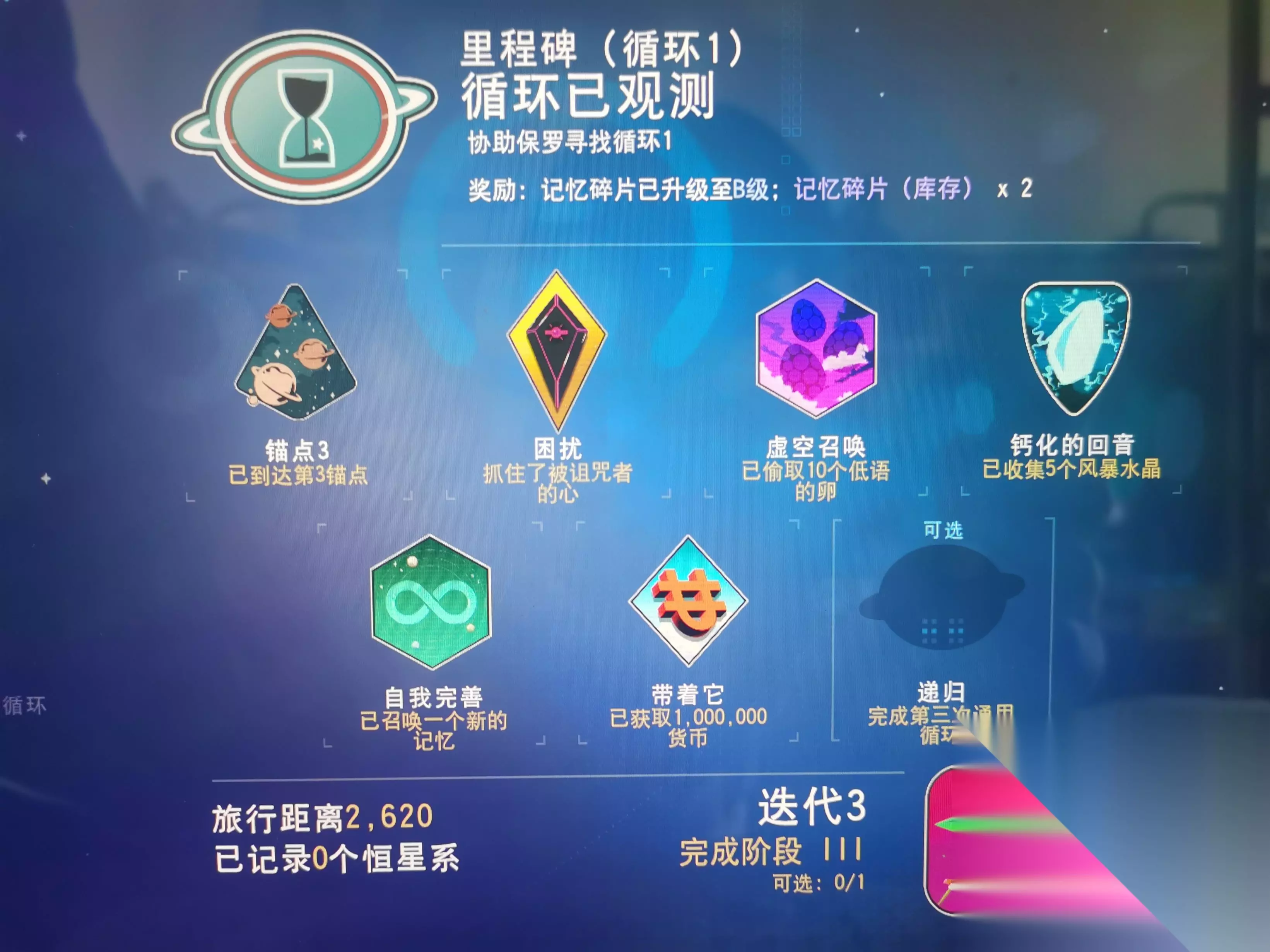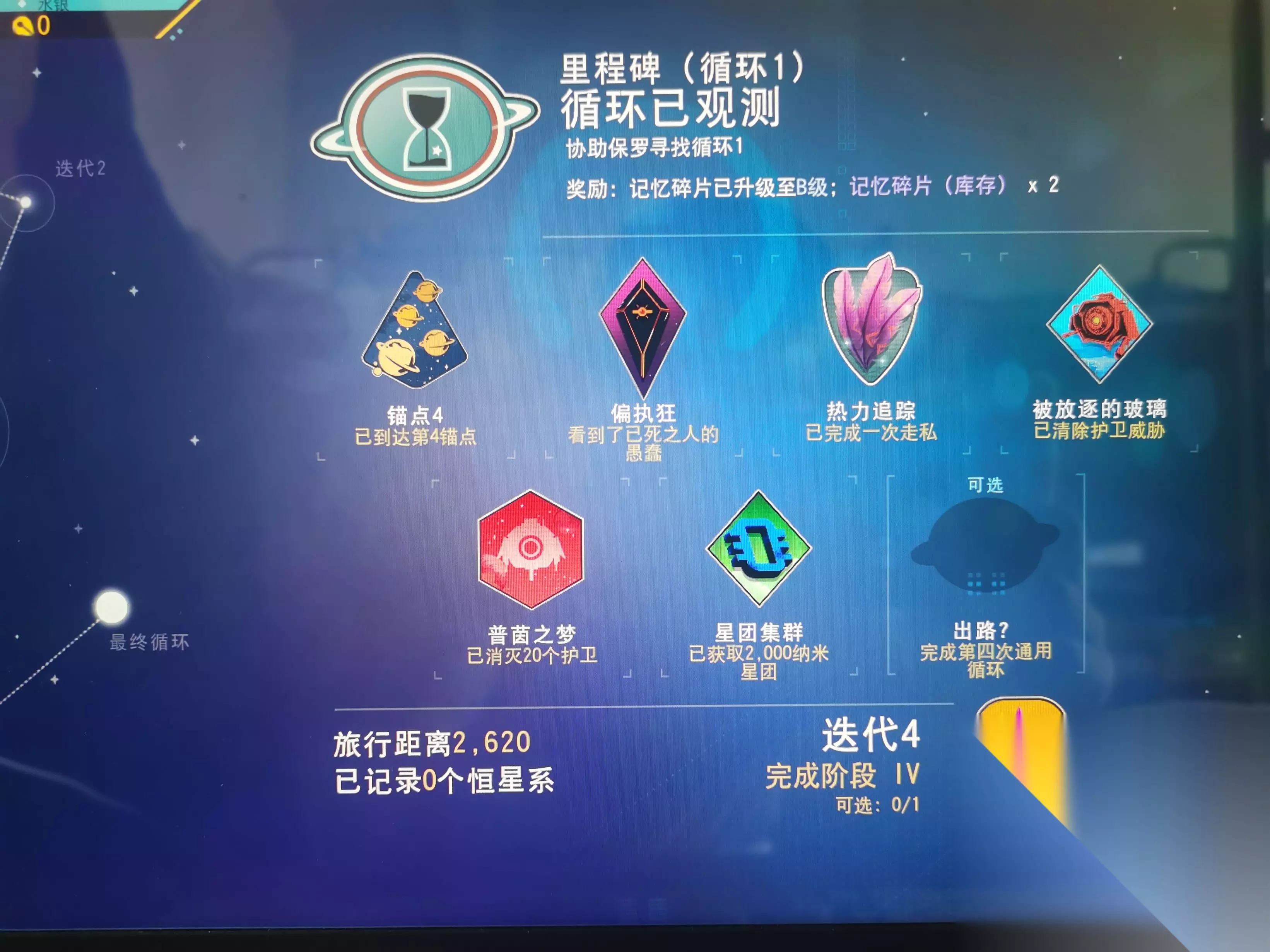 阶段四前往锚点4所在星球,在大量通讯站堆积地降落即可完成任务《锚点4》 在锚点4星球使用记忆共振器,获取任务目标地点,前往和坟墓交互后完成任务《偏执狂》 同时,锚点4星球是一个极端环境星球,刮风暴时会出现风暴水晶,采集五个完成阶段三第四个任务《钙化的回音》 送的记忆碎片都开一开,把开出来模块卖了凑齐两千纳米完成任务《星团集群》(开出来的灰色的模块最值钱,一个卖四百九十多纳米)