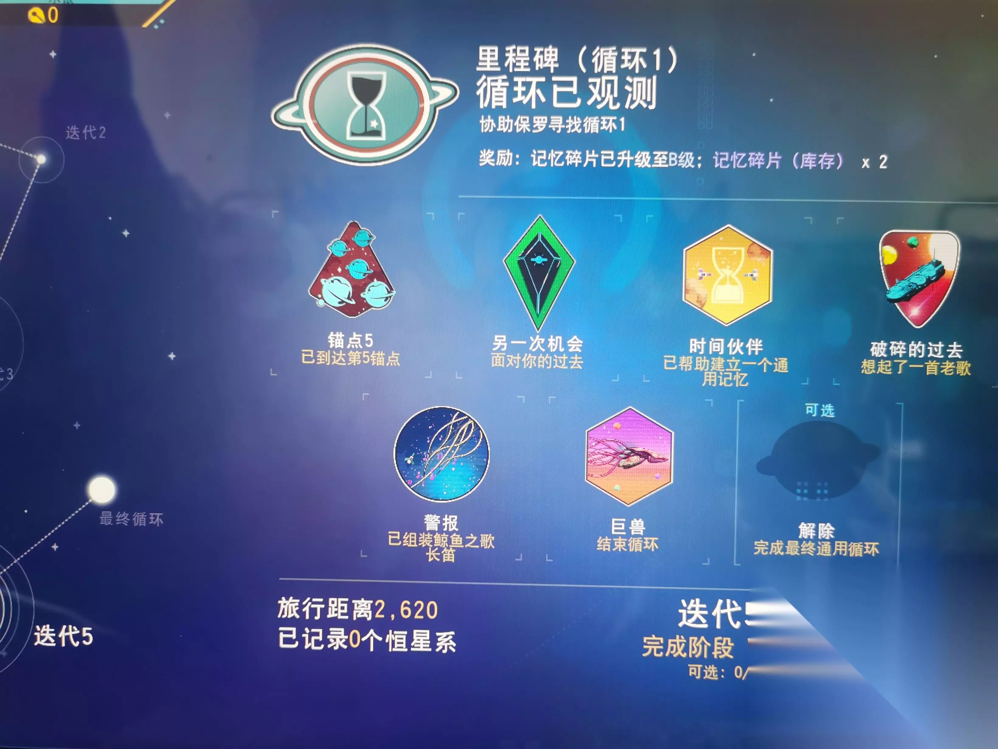 阶段五前往锚点5所在星球,在大量通讯站堆积地降落即可完成任务《锚点5》 在锚点5星球使用记忆共振器获取任务目标地点,前往与坟墓交互完成任务《另一次机会》 此时应该会让你进入太空脉冲,在太空脉冲会遇见一个废弃货船,在货船上降落,并探索该废弃货船,探索结束后完成任务《破碎的过去》,获得鲸鱼之歌长笛设计图 在背包里制作一个长笛完成任务《警报》 在太空使用长笛后会出现目标地点,飞过去会出现生物护卫舰——利维坦,对话结束后会显示被巨兽吞噬死亡,然后被强制退出到模式选择界面。此时重新加载进入远征档,朝飞船走几步就会显示完成最后的任务《巨兽》