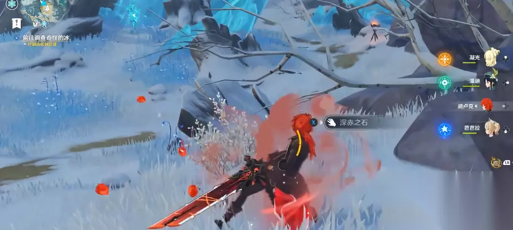 在雪山探险时,你会遇到一些无法用普通攻击或火元素技能解冻的大冰块。这些冰块需要借助一种叫深赤之石的特殊资源才能破除。深赤之石通常分布在冰块附近,外观是红色的矿石,击碎后会掉落红色能量球,捡起来就能获得短暂buff。带着这个buff去攻击冰块,就能成功解冻。记得buff有时间限制,如果距离冰块太远可能会失效,所以最好提前规划路线哦。
