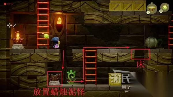 来到底层先使用蜡烛泥怪将下面的篝火点燃,右侧被石头挡住的地方直接放一张床能直接走过去,然后爬上石头右侧的楼梯。