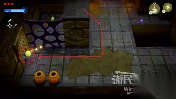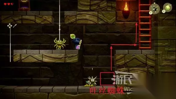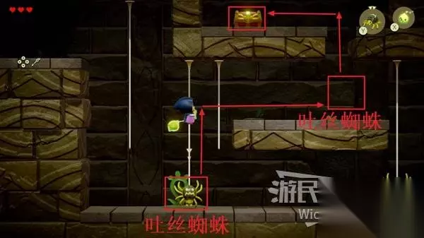 接着按照下图红框位置依次放置吐丝蜘蛛,吐丝蜘蛛可以直接当做一个便捷楼梯使用。 通过这个路线拿到上方的宝箱获得迷宫地图。