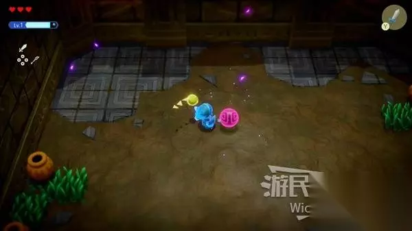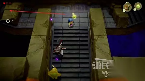 林克消失后留下了力量之剑,与剑互动可以开启塞尔达的剑士形态,变身剑士形态将前面的紫色路障破坏,通过里面的楼梯口继续前进。