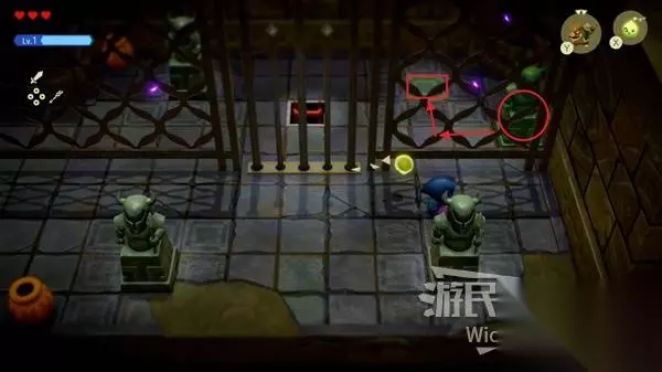 将这个房间里右边角落的绿色雕像移动到红框的位置即可打开牢门,通过楼梯口往下走。