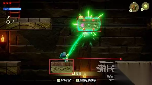 使用同步能力牵引里面的绿色雕像,然后跟着下图路线走一遍,走到右边大门处停止,雕像碰到机关即可开启宝箱。