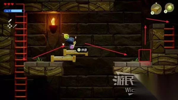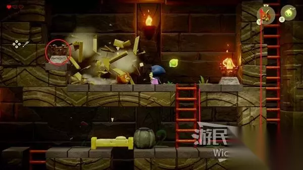 往左侧木箱处放一只邦吉罗将木箱全部破坏掉,使用蜡烛泥怪将左侧的篝火点燃,右下的大门解锁,通过右侧楼梯离开这个区域。