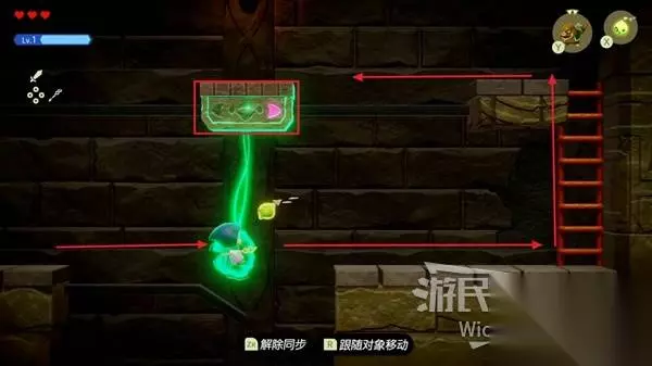 往上推动左摇杆,让塞尔达看墙,等待上面的板块移动到正上方直接使用同步对调能力,让板块带我们移动到右侧。
