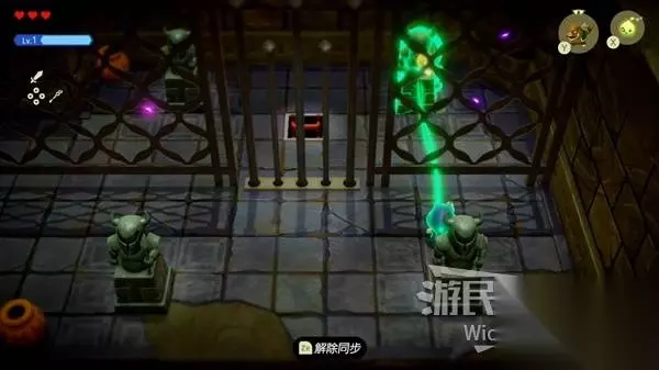 在这个房间,先同步右侧的雕像,往左移动到下图所示位置放一个跳床,当我们跳起来时雕像也会跟着起来,让雕像下落到左侧石柱机关上即可开启牢房。