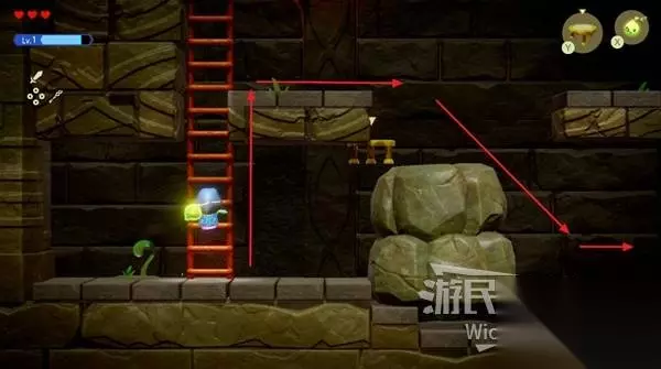 打开宝箱后原路返回,跳到最底层往右走,使用同步能力操控巨石往左移动。