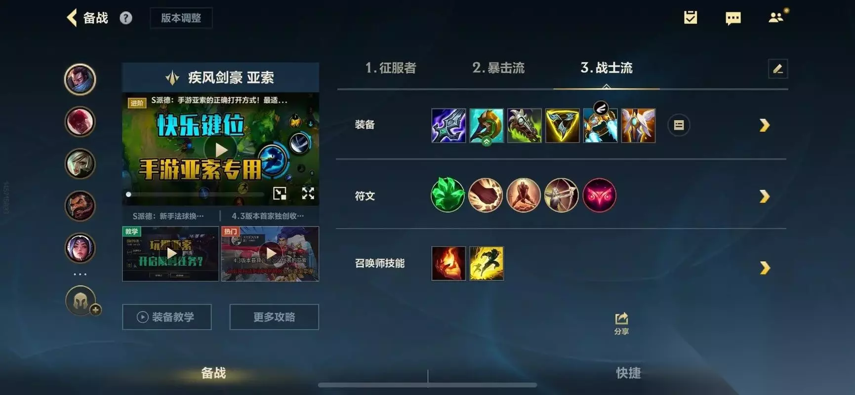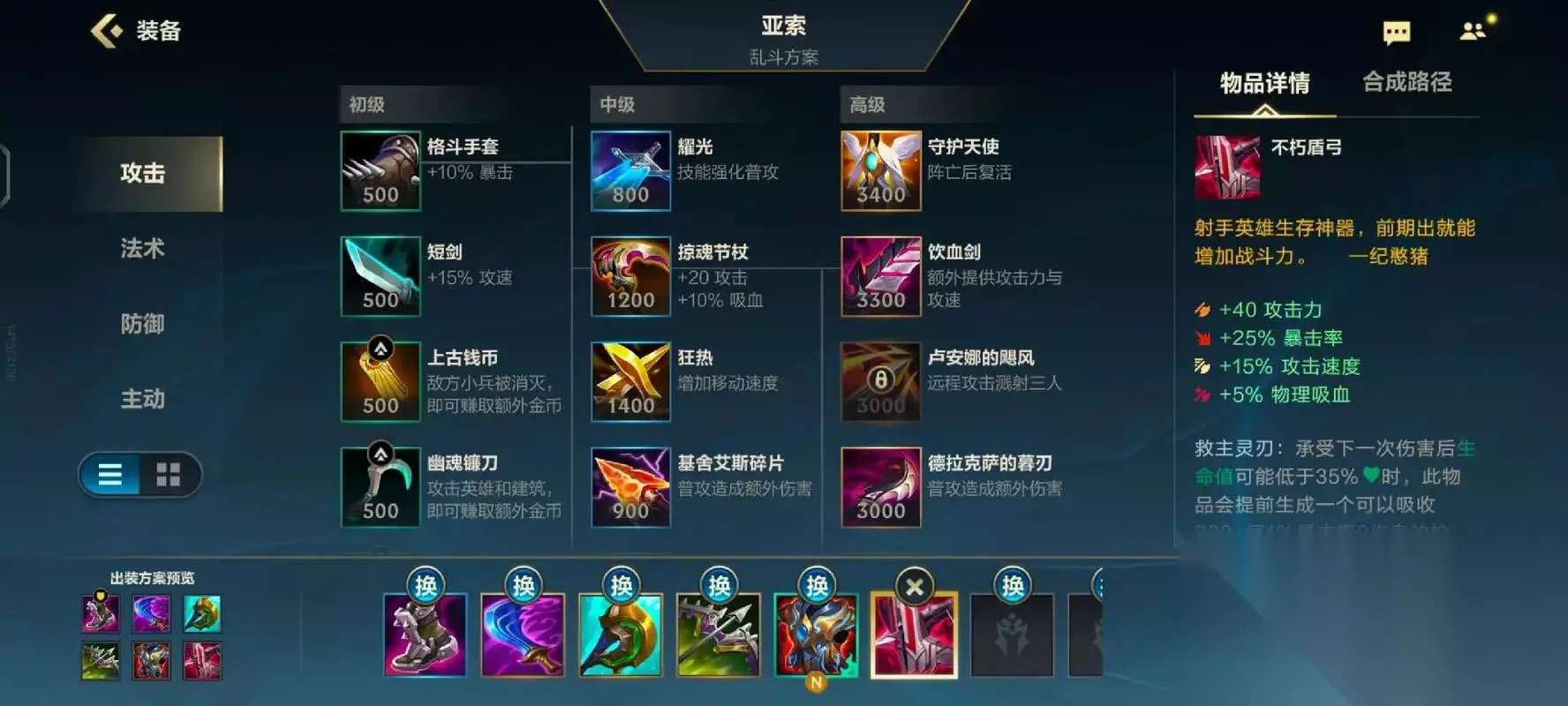 符文与出装策略 符文选择方面,征服者是不二之选。这个符文能为亚索提供持续作战所需的适应之力,并在叠满后提供治疗效果,完美契合亚索需要频繁使用技能穿插普攻的战斗风格。 出装思路需要根据对局情况灵活调整: 第一件装备通常选择攻速鞋。亚索的技能冷却时间受攻速加成影响,早期攻速提升能显著增强他的技能频率和连招流畅度。 第二件装备可在破败王者之刃与幻影之舞之间选择。幻影之舞提供无视单位碰撞体积的效果,让亚索在兵线和团战中穿梭更加自如;破败则提供生命偷取和百分比伤害,面对坦克阵容时效果显著。 第三件装备无尽之刃是亚索的核心输出装。它不仅大幅提升暴击伤害,还能让一技能享受暴击加成,这是亚索中期伤害质变的关键。 第四件装备凡性的提醒(破甲弓)能有效应对敌方前排坦克,其重伤效果也能克制回复型英雄。这件装备提供的暴击率对亚索同样重要。 最后两件装备可根据局势选择。自信的玩家可选择守护天使和饮血剑,最大化输出与生存能力;若团队需要更稳定的前排,则可考虑振奋铠甲或兰顿之兆,提升容错率。