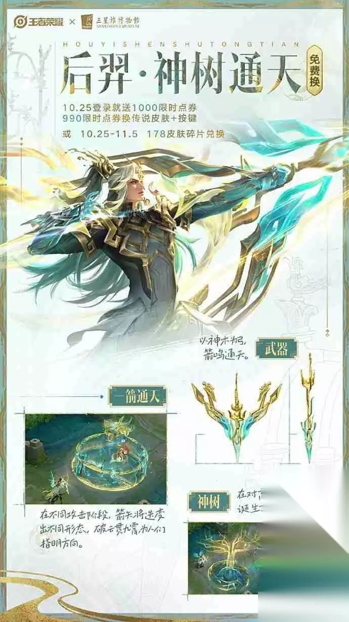 王者荣耀后羿女娲三星堆联动皮肤入手建议 一、后羿女娲三星堆皮肤免费得 1. 后羿 - 神树通天(史诗) (1)灵感来源:三星堆青铜神树,象征“通天达神”。 (2)设计亮点:以神木为弓,箭矢随攻击阶段变化形态,大招化作金乌飞越战场,特效华丽。 (3)获取方式: - 限时兑换:2025年10月25日–11月12日,990限时点券购买【超值皮肤礼包】(含个性按键); - 碎片兑换:10月25日–11月5日,皮肤碎片商店开放,178碎片直接兑换。 - 关键福利:参与【燃灯寄梦】活动(10月15日–11月5日),最高赢取2000限时点券;10月25日登录再领1000点券,轻松凑齐兑换所需!