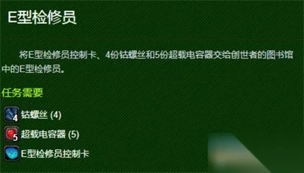 3、接着使用鼠标右键点击e型检修员的控制卡可以触发一个收集任务,e型检修员。 ps:这时需要我们去寻找材料,4个螺丝钉、5个超载电容器,都可以都可以在拍卖行进行购买。