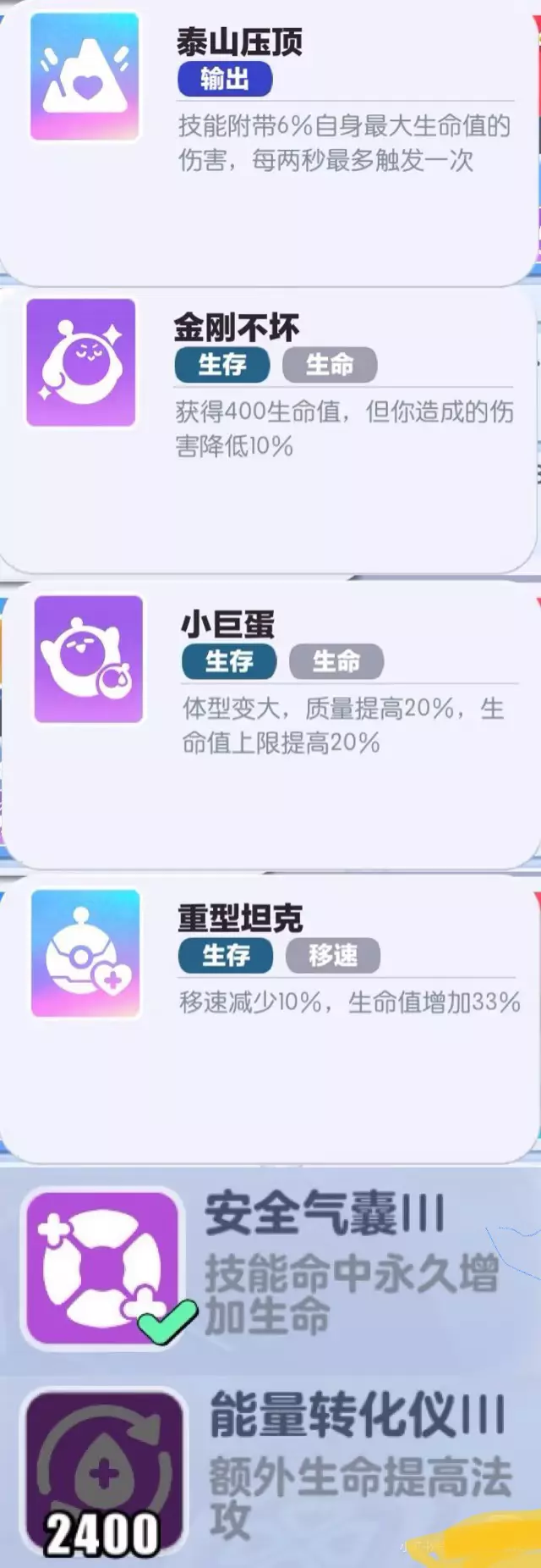——前言—— 一种只适用于大乱斗的新版小蓝出装方法,后期又能扛又能打 ——卡牌—— 这套出装方法的核心卡牌是【泰山压顶】,如果开局就选到了这张卡牌,那么可以直接走这套肉小蓝的思路。当然如果没有这张卡牌的话也能用,但是强度会有所下降。 优先选择【金刚不坏】以及其他增长固定生命值的卡牌,其次选择【重型坦克】【铁锚羁绊】【小巨蛋】以及其他增长百分比生命值的卡牌,这个后面会讲原因。 其余卡牌优先度见攻略1。 ——装备—— 核心装备为【安全气囊】【能量转化仪】,【安全气囊】能够增加百分比最大生命值,【能量转化仪】能够将额外的生命值转化为法术攻击力,但是请注意‼️【能量转化仪】只能转化额外的固定生命值,所以并不能转化【安全气囊】提供的百分比最大值,也就不能实现无限的转化,这也是前面卡牌选择的原因所在。 其余装备选择依次为【传感接收器】提供吸血保证续航能力,【降温斗篷】提供生命值与冷却缩减,【护壳心衣】配合卡牌效果进一步发挥优势。 这套出装方法前期与大后期非常强势,而在大多数能够结束游戏的中期会较同时期全输出小蓝略逊一筹,请谨慎使用❗️ 原创不易严禁抄袭,个人思路不足之处敬请指正 #蛋仔派对 #蛋仔派对超燃大乱斗 #蛋仔派对小蓝