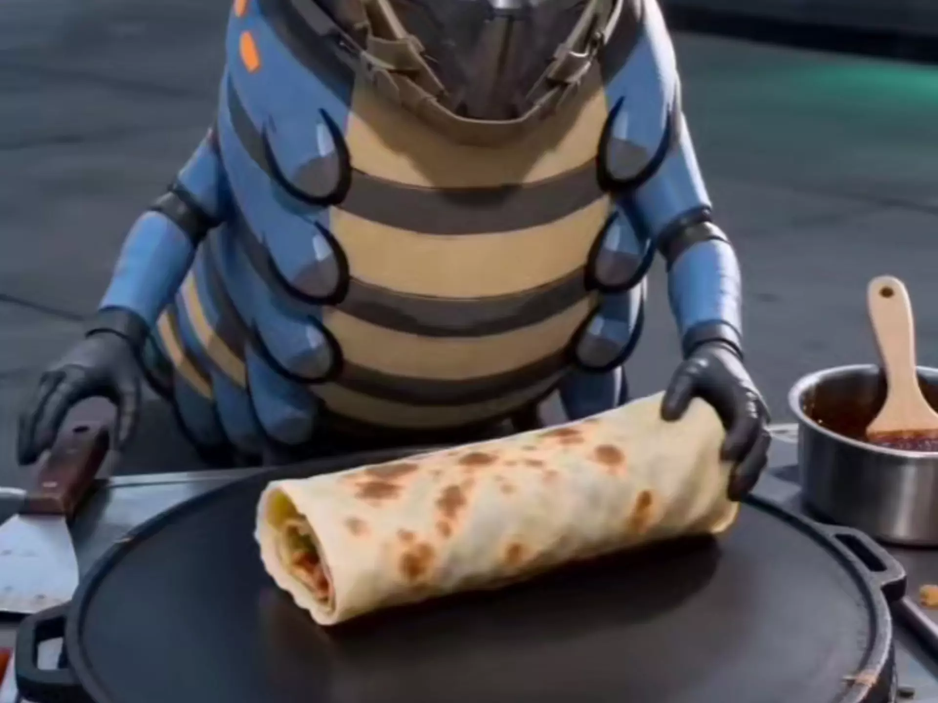 这是一组AI生成的趣味图文,展示了有着龙女特征的“城主”在街头制作煎饼果子的过程,画面将奇幻风格角色与市井美食结合,十分有趣。