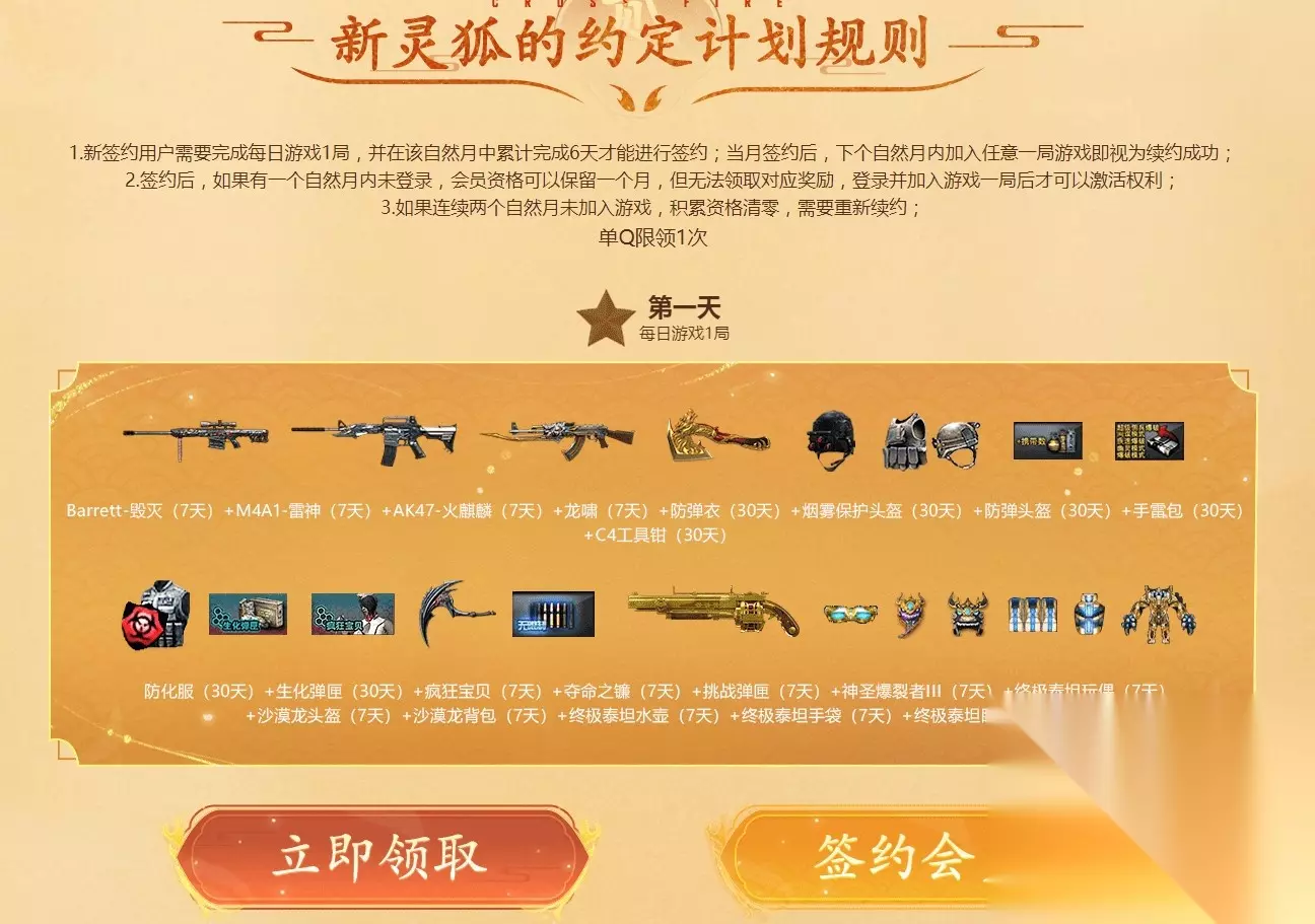 《CF》9月灵狐者的约定活动2022 活动时间:2022年9月1日至2022年9月30日 活动内容 1、灵狐约定特权专属月度奖励 灵狐的约定计划新会员成功签约/老会员续约可立即领取——已签约用户需要本月游戏一局后可领取,——新用户需要当月成功签约后可领取(累积完成6天游戏)