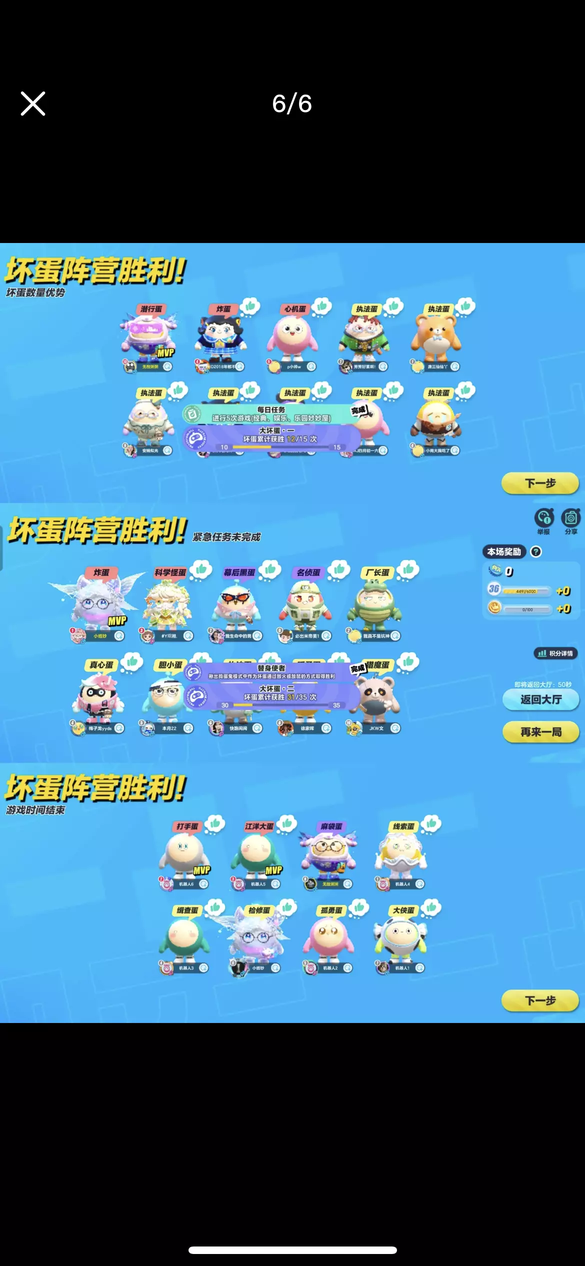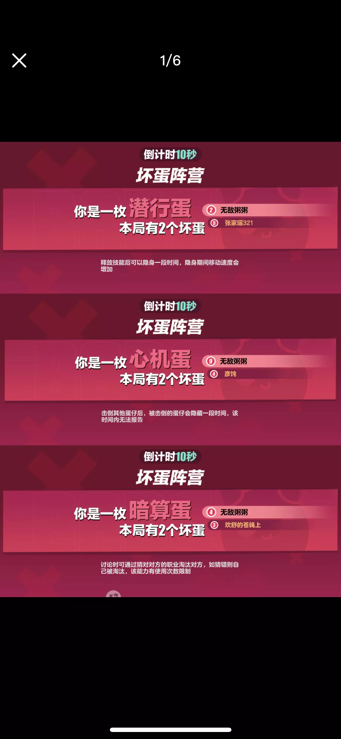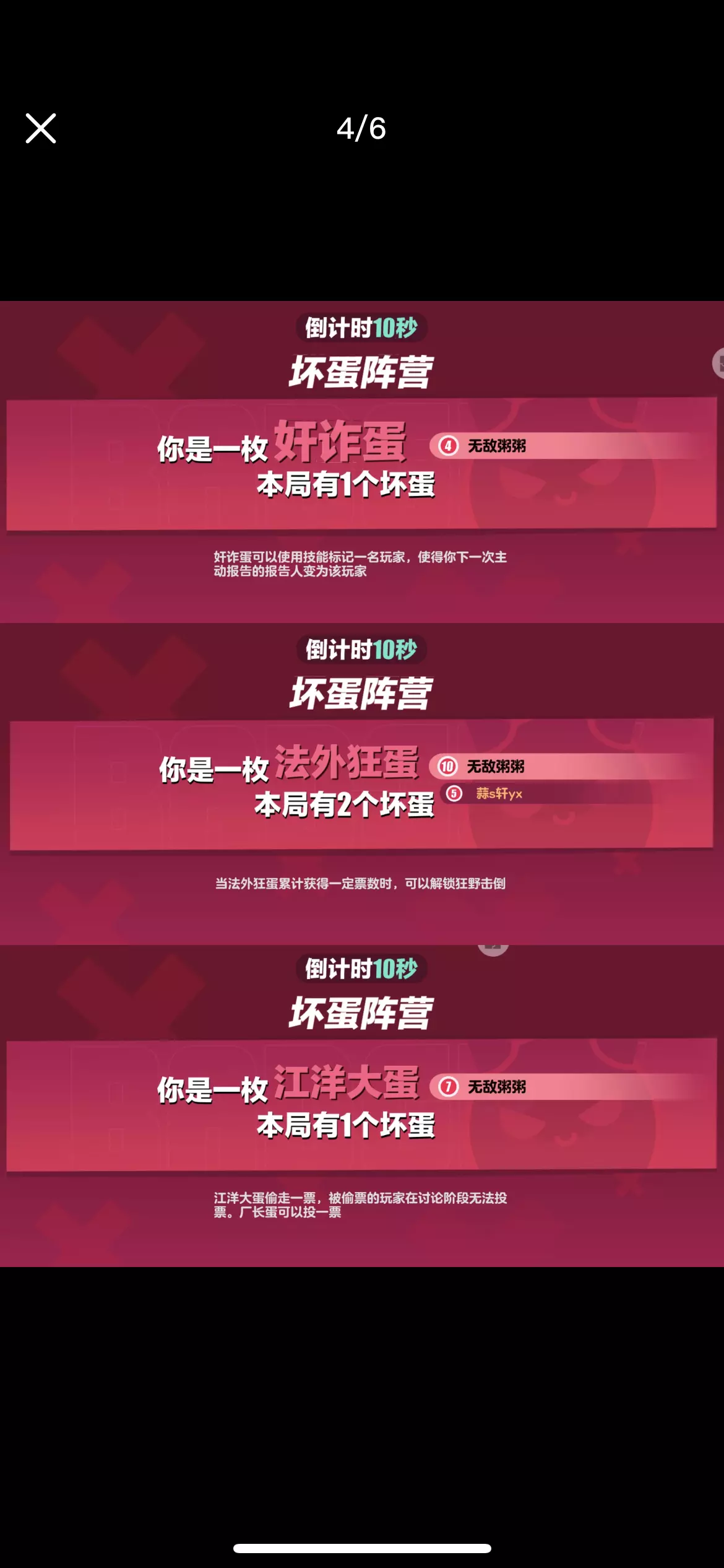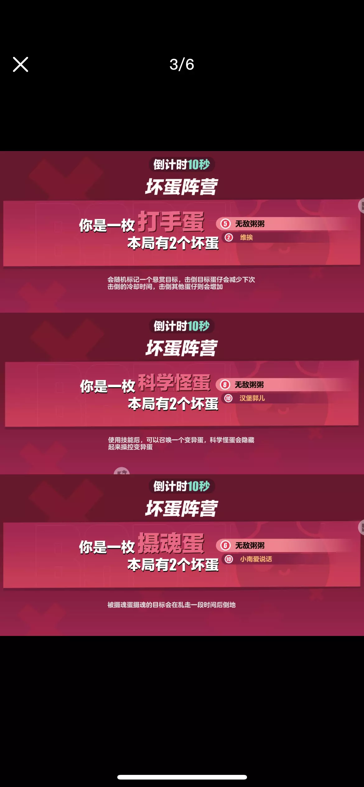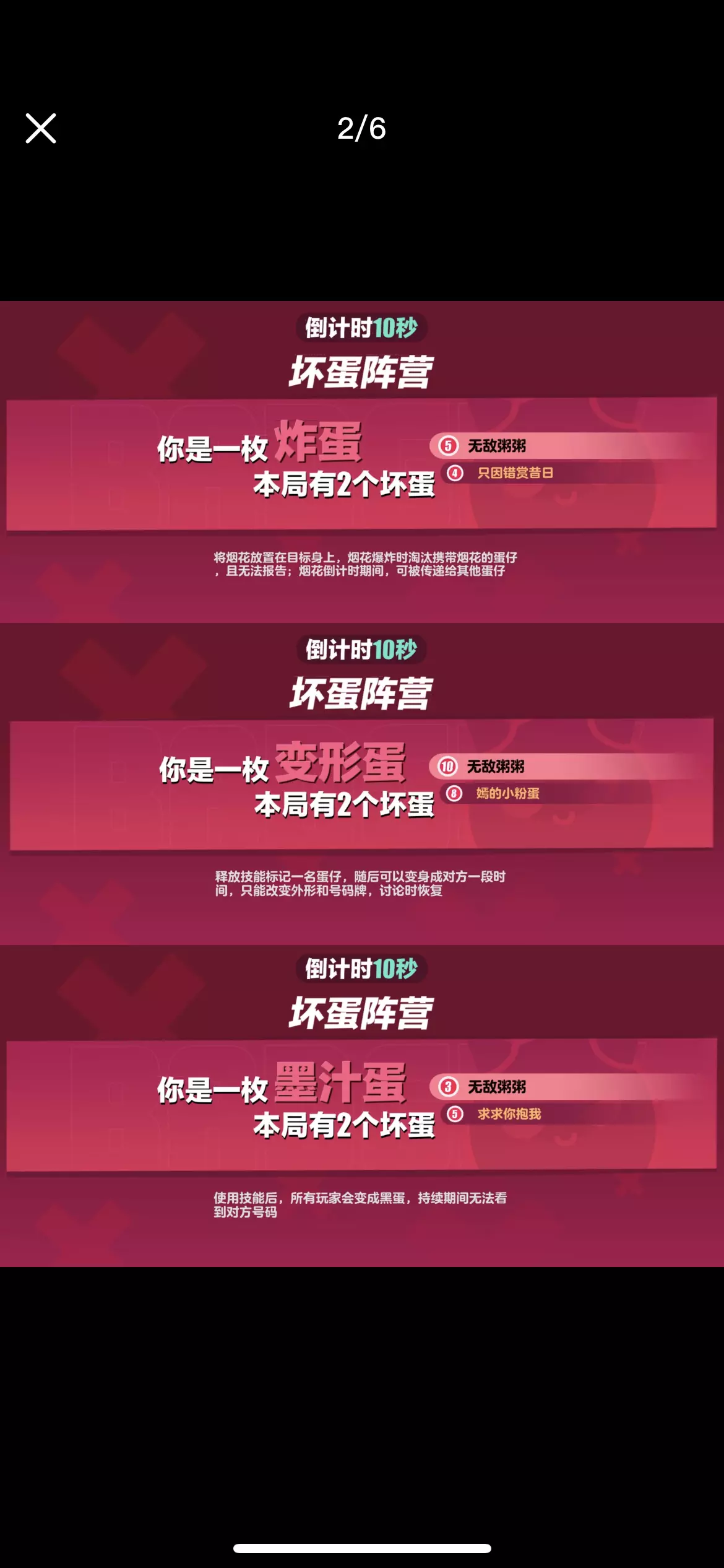 ▶️坏蛋阵营胜利条件有3种,分别是: 1.坏蛋数量优势 2.紧急任务未完成 3.游戏时间结束 ⏺坏蛋阵营目前有以下职业,分别是: 1.潜行蛋 技能:可以隐身一段时间,一段时间后显形! 2.心机蛋 技能:被心机蛋淘汰的玩家会自动隐身一段时间,一段时间后显形! 3.暗算蛋 技能:可以在讨论期间猜测一名玩家的身份,猜对身份则该名玩家被淘汰,猜错身份则自己被淘汰!该技能只能使用1次! 4.炸蛋 技能:可以给一名玩家传递一枚炸弹,炸弹倒计时结束,身上有炸弹的玩家将被淘汰!炸弹倒计时期间可以传递给别的玩家! 5.变形蛋 技能:使用技能标记一名玩家,随后可以变成对方的样子一段时间,一段时间后变回原形!变身期间会改变外貌和编号! 6.墨汁蛋 技能:可以把场上所有的玩家变成黑蛋一段时间,一段时间后显形! 7.打手蛋 技能:刀对目标CD变成7秒,刀错目标CD变成30秒! 8.科学怪蛋 技能:可以变身成变异蛋,变身期间会隐藏外貌和编号,一段时间后变回原形!变身期间不会被攻击淘汰!变异蛋可以使用加速鞋! 9.摄魂蛋 技能:被摄魂的玩家会乱走一段时间后倒地! 10.奸诈蛋 技能:标记一名玩家,拉铃后会变成被标记的玩家发起讨论! 11.法外狂蛋 技能:在讨论期间,累积被投一定的票数,可以解锁“狂野击倒”(简称双刀)! 12.江洋大蛋 技能:标记一名玩家,被标记的玩家在本轮讨论期间只能弃票,而江洋大盗在本轮期间可以投2票,下轮讨论期间恢复正常! . 备注: 该贴子仅为2024年12月版蛋仔派对-揪出捣蛋鬼,后面不会进行任何更改! 再见啦,2⃣0⃣2⃣4⃣年!你好,2⃣0⃣2⃣5⃣年!坏蛋胜利难不难?