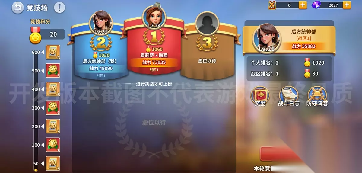 除了统帅们已经体验过的赛季对战,新版本还增加了另一个PVP玩法——竞技场。 「竞技场」玩法的结算周期更加短暂,每周7天为一轮,每天和每轮都会根据竞技积分结算钻石、幸运徽章、5星指挥官碎片等丰厚奖励,玩法更加紧张刺激! 目前竞技场仅限战区内战斗,后续还会陆续开放与相邻战区一同竞技。谁能问鼎指挥官之间的终极对决,让我们拭目以待吧~ 【排行榜功能】