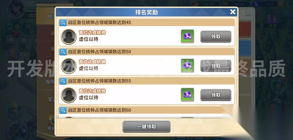 一款战争对战类游戏怎么会少了排行榜呢? 无论你喜欢PVE或PVP,无论是占领城镇攻城略地、培养心爱的指挥官、还是带领军团发展壮大,统帅们都可以在自己的战区乃至全服找到一席之地! 去战斗吧!冲刺排行榜、挑战榜单成就,还将为战区解锁大量钻石奖励。 今天的版本前瞻就介绍到这里啦,是不是干货满满? 其实统帅部在体验版本里还看到了很多新的福利活动,容我先卖个关子,问问制作人正式版本会不会实装,说不定下一篇前瞻就可以给统帅们来一个福利专集呢?