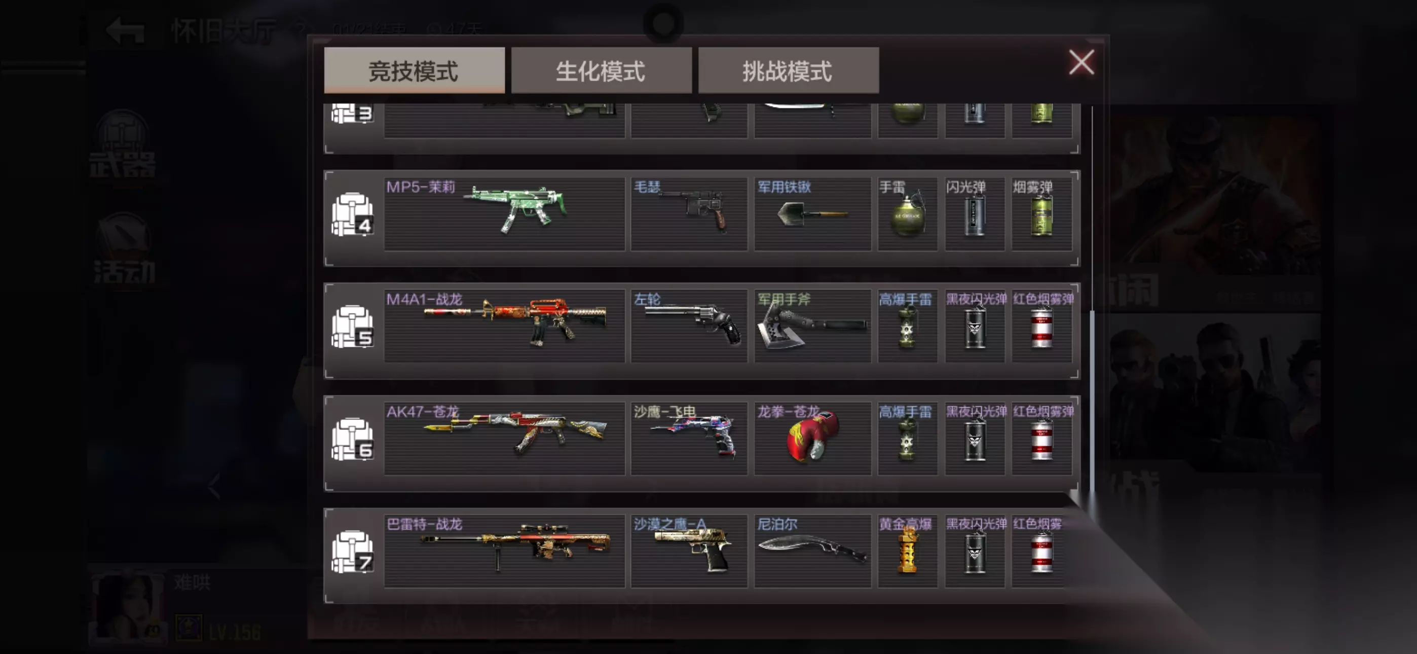 背包共计7个背包,默认解锁前3个背包,每完成一局游戏都可以解锁一个背包,4-7号背包武器如图所示。2016年CF手游谁能忍住不拾取地上掉落的M4A1-战龙以及AK47-苍龙呢?