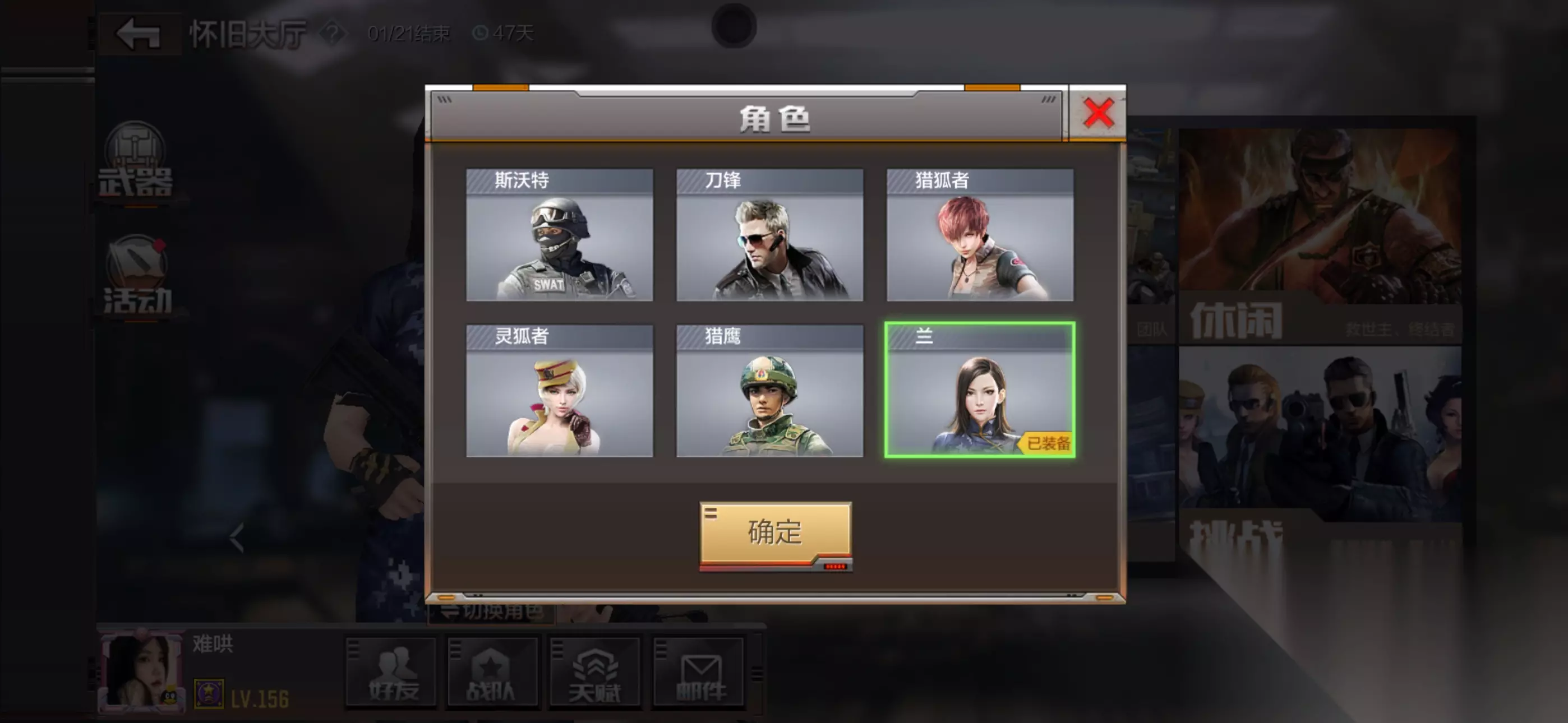 角色选择在大厅页面进行,角色拥有技能不同,推荐选择猎鹰或者兰。猎鹰拥有竞技消灭后增加3秒移速的技能,兰则可以免疫己方手雷伤害。
