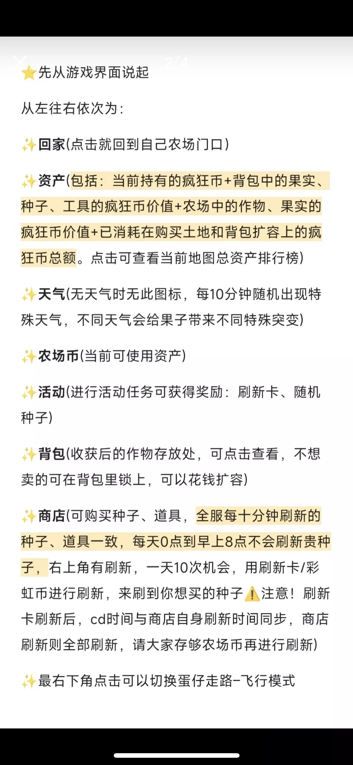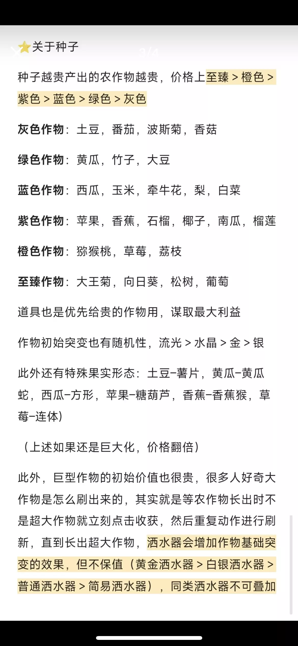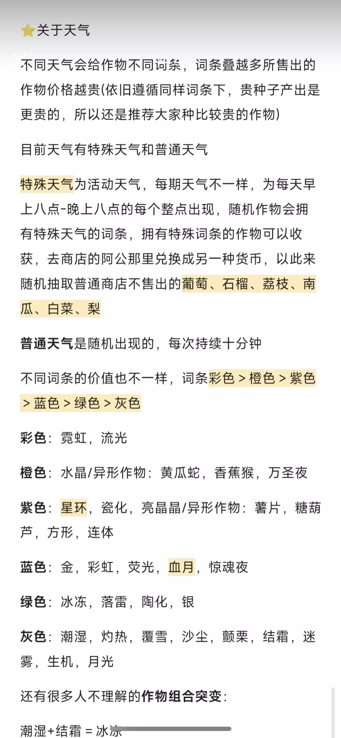 🎉10.4初版不定期更新🎉 由于字太多了码成图片,大家翻图片自行保存 ⭐一些个人便捷小技巧/经验 每次登录农场有概率被人机赠送果实,果实多半是瓷化/水晶+冰冻,喜欢可以锁起来留下,不喜欢就卖掉,人机送的果实一般过万,是新手蛋们快速获取农场币的渠道之一 不需要一直肝,每隔一个小时上线收一下就行,一般三四个词条就可以收,那种有彩光紫光的词条可以锁起来等叠满再收,或者单纯摆地里,好看 长摁收获键可快速收获成片作物 背包有个背篓,筛选词条1-5可以快速查找新长出来的基础突变作物 还想让某作物继续生长叠词条,点击锁 不想卖背包里的作物,点击锁 特殊天气(星环 已结束/血月)太难找了,天气结束后点击左上角退出游戏,会显示一共种出的星环数量,此时点返回游戏,就可以按照数字去地里找啦 暂时这么多,想到会补,欢迎大家评论区讨论交流,也可以在评论区分享自己种的值钱作物哦 #蛋仔派对 #蛋仔派对疯狂农场 #疯狂农场