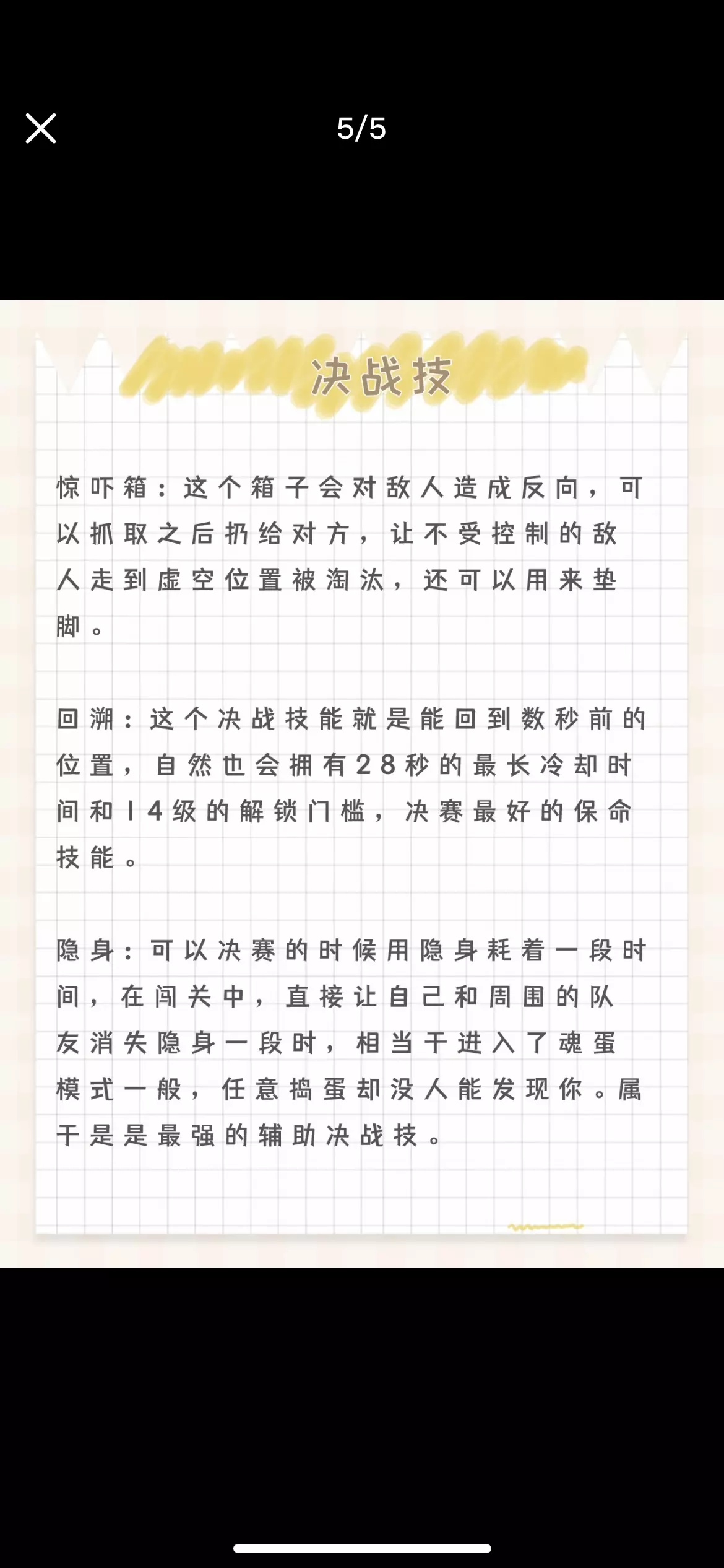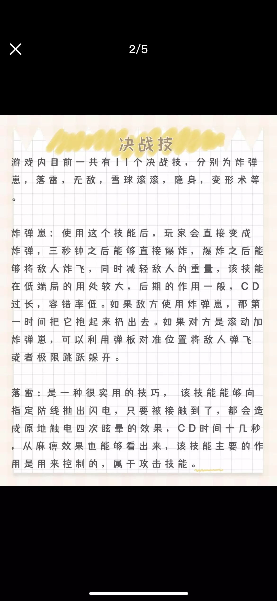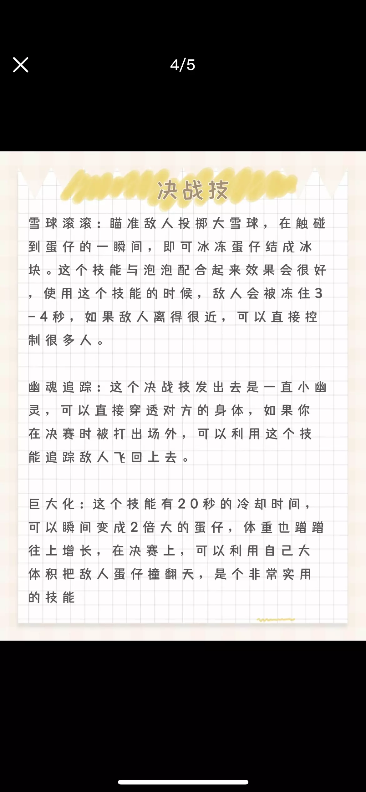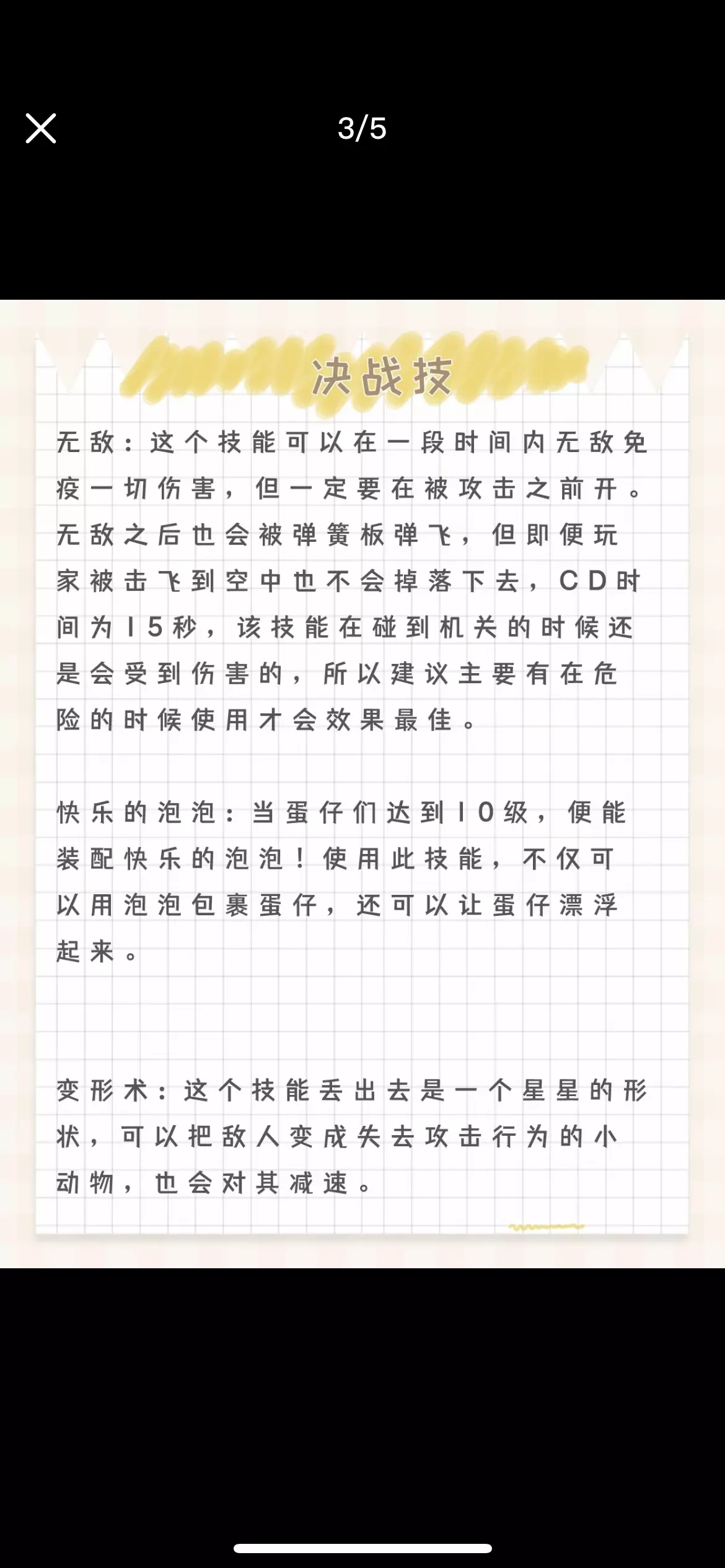 游戏内目前一共有11个决战技,分别为炸弹崽,落雷,无敌,雪球滚滚,隐身,变形术等。 炸弹崽: 使用这个技能后,玩家会直接变成炸弹,三秒钟之后能够直接爆炸,爆炸之后能够将敌人炸飞,同时减轻敌人的重量,该技能在低端局的用处较大,后期的作用一般,CD过长,容错率低。如果敌方使用炸弹崽,那第一时间把它抱起来扔出去。如果对方是滚动加炸弹崽,可以利用弹板对准位置将敌人弹飞或者极限跳跃躲开。 落雷:是一种很实用的技巧, 该技能能够向指定防线抛出闪电,只要被接触到了,都会造成原地触电四次眩晕的效果,CD时间十几秒,从麻痹效果也能够看出来,该技能主要的作用是用来控制的,属于攻击技能。 无敌:这个技能可以在一段时间内无敌免疫一切伤害,但一定要在被攻击之前开。无敌之后也会被弹簧板弹飞,但即便玩家被击飞到空中也不会掉落下去,CD时间为15秒,该技能在碰到机关的时候还是会受到伤害的,所以建议主要有在危险的时候使用才会效果最佳。 快乐的泡泡:当蛋仔们达到10级,便能装配快乐的泡泡!使用此技能,不仅可以用泡泡包裹蛋仔,还可以让蛋仔漂浮起来。 变形术:这个技能丢出去是一个星星的形状,可以把敌人变成失去攻击行为的小动物,也会对其减速。 雪球滚滚:瞄准敌人投掷大雪球,在触碰到蛋仔的一瞬间,即可冰冻蛋仔结成冰块。这个技能与泡泡配合起来效果会很好,使用这个技能的时候,敌人会被冻住3-4秒,如果敌人离得很近,可以直接控制很多人。 幽魂追踪:这个决战技发出去是一直小幽灵,可以直接穿透对方的身体,如果你在决赛时被打出场外,可以利用这个技能追踪敌人飞回上去。 巨大化:这个技能有20秒的冷却时间,可以瞬间变成2倍大的蛋仔,体重也蹭蹭往上增长,在决赛上,可以利用自己大体积把敌人蛋仔撞翻天,是个非常实用的技能。 惊吓箱:这个箱子会对敌人造成反向,可以抓取之后扔给对方,让不受控制的敌人走到虚空位置被淘汰,还可以用来垫脚。 回溯:这个决战技能就是能回到数秒前的位置,自然也会拥有28秒的最长冷却时间和14级的解锁门槛,决赛最好的保命技能。 隐身:可以决赛的时候用隐身耗着一段时间,在闯关中,直接让自己和周围的队友消失隐身一段时,相当于进入了魂蛋模式一般,任意捣蛋却没人能发现你。属于是是最强的辅助决战技 #游戏日常 #蛋仔派对 #蛋仔日常 #蛋仔派对蛋搭节