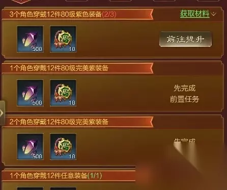 仔细查看各养成线任务的说明,能更好的帮助大家完成任务! 任务未完成前,大家可以点击获取材料,可查看完成任务所需材料的获取途径,助力大家更快完成各项任务! 接下来为大家介绍,装备穿戴、装备强化、装备升星、坐骑、披风、神器、灵珠每个篇章对应的不同任务!