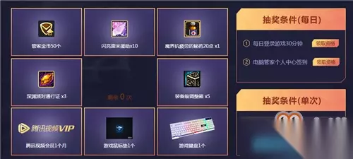 3、天天抽奖激情派送 在活动期间玩家可以通过各种方式来获得抽奖机会,奖品中有深渊通行证、装备调整箱、鼠标垫和游戏键盘等等。