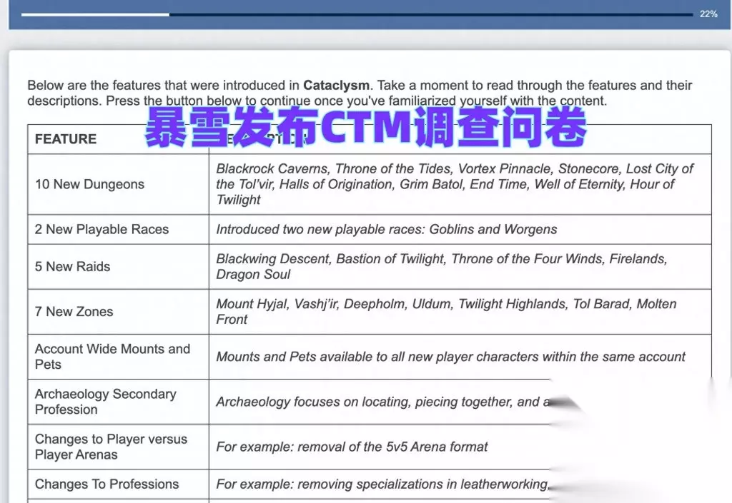 暴雪认为有21项改动可能是导致大灾变资料片失败的元凶,因此暴雪将这些改动全部都列了出来,让玩家选出最不喜欢的改动,分别是: 1、公会成长系统 2、全新的职业设计 3、统一团本掉落 4、装备属性重铸系统 5、艾泽拉斯的地图和任务重做 6、7张新地图 7、等级提升到85 8、户外PVP改动 9、新的天赋系统 10、新的收藏界面 11、新增的2个种族 12、新战场托尔巴拉德 13、新增的考古学 14、5个全新的团队副本 15、5V5竞技场被取消 16、坐骑和宠物战网通用 17、随机团本查找器 18、取消专业专精 19、游戏质量细节调整 20、10个新的地下城 21、新增评级战场 就小探当年在CTM的游戏体验而言,最不喜欢的改动有这些: