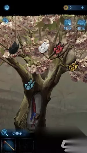 5、然后继续点击树下面的花丛,这样的话就可以获得一个纸伞了。继续点一个飞舞的蝴蝶,这样的话就可以获得玉蝴蝶。