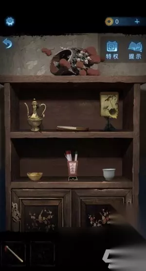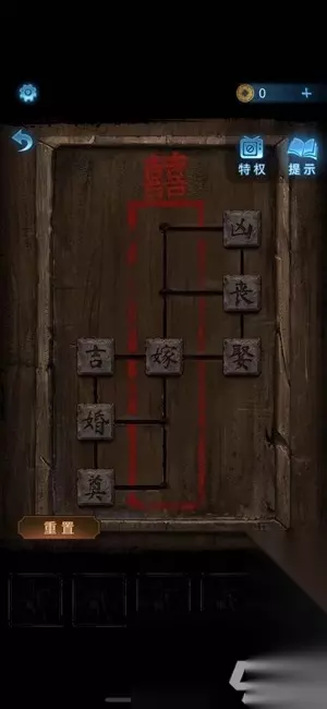 8、把红绣鞋放到火盆中就能打开墓碑后的暗门,走进入用纸伞开门,退出暗门屏幕上会出现文字。 9、再点击座位上的木盒,将文字摆成“奠丧婚吉嫁”后就能开启并获得化妆笔。