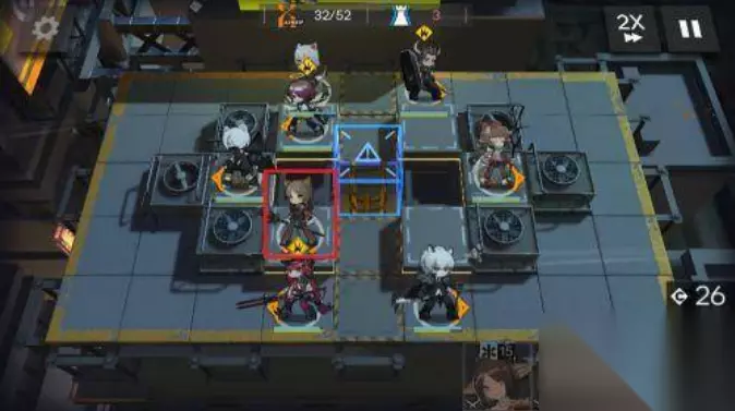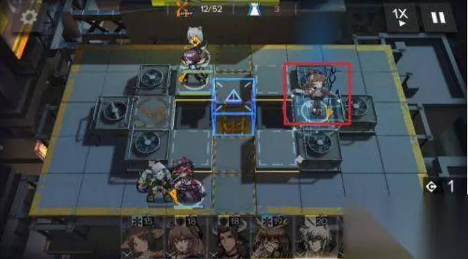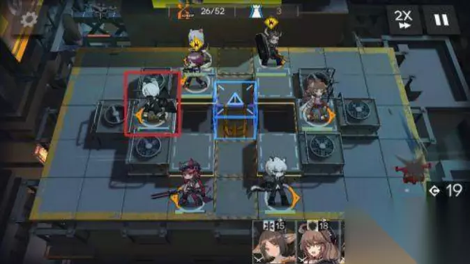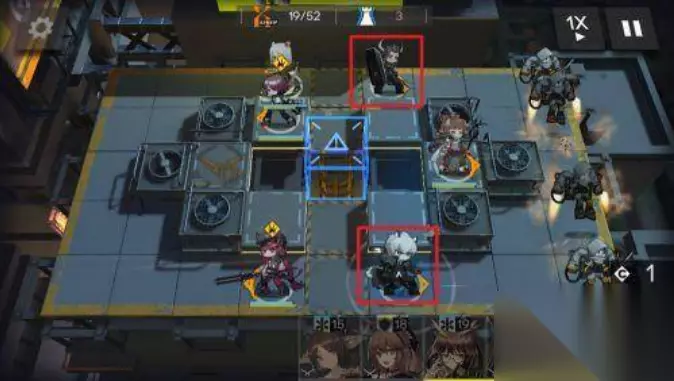 3、完成先锋干员的摆放后,在右侧特殊位置放一个远程输出干员。攻击方向朝右。