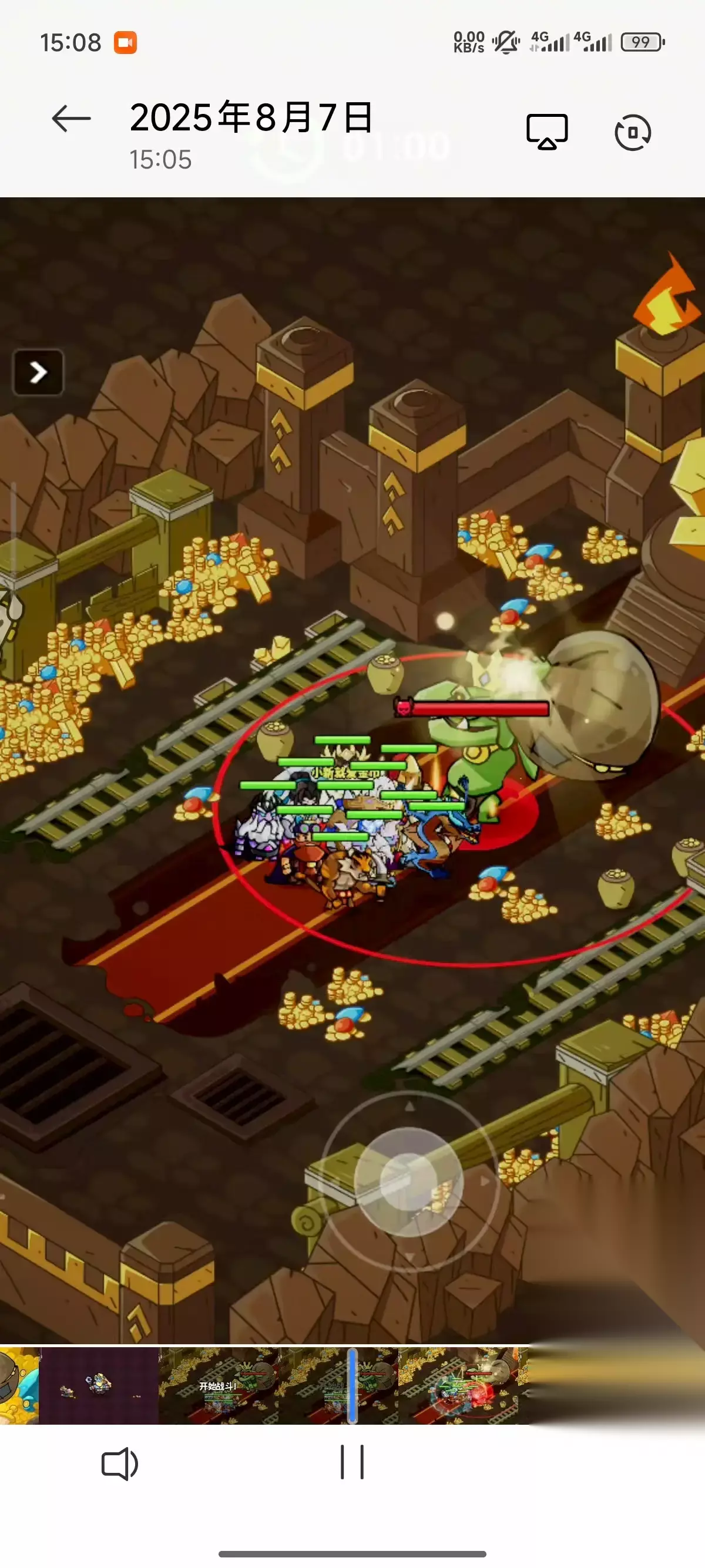 7、进去,显示开始战斗后,往右上划一下,让榴莲站到地精脚下(如上图),这样基本上全部都能集中到地精下 8、装备:左三件有攻速带攻速,有条件,洗两件攻速套装带上 9、影响攻击次数的因素还有:羁绊攻击、宠物冷却。所以就算同阵容,每个人的攻击次数会不一样。 10、建议大家换英雄、换站位多试几次!