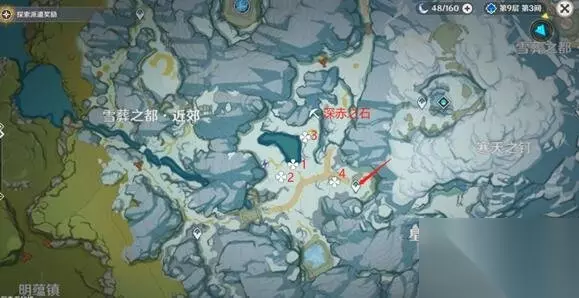 4、以下图中所示为在龙脊雪山丢失的勘测坐标位置以及深赤之石的位置。
