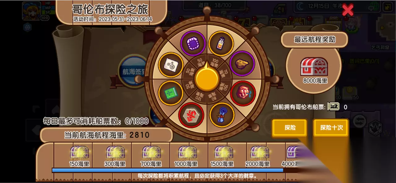 (仅为游戏UI示意页面,非最终效果) 消耗稀有的哥伦布船票开启航海转盘,每次开启转盘都将获得随机的道具,航程数,固定数量的大洋徽章。