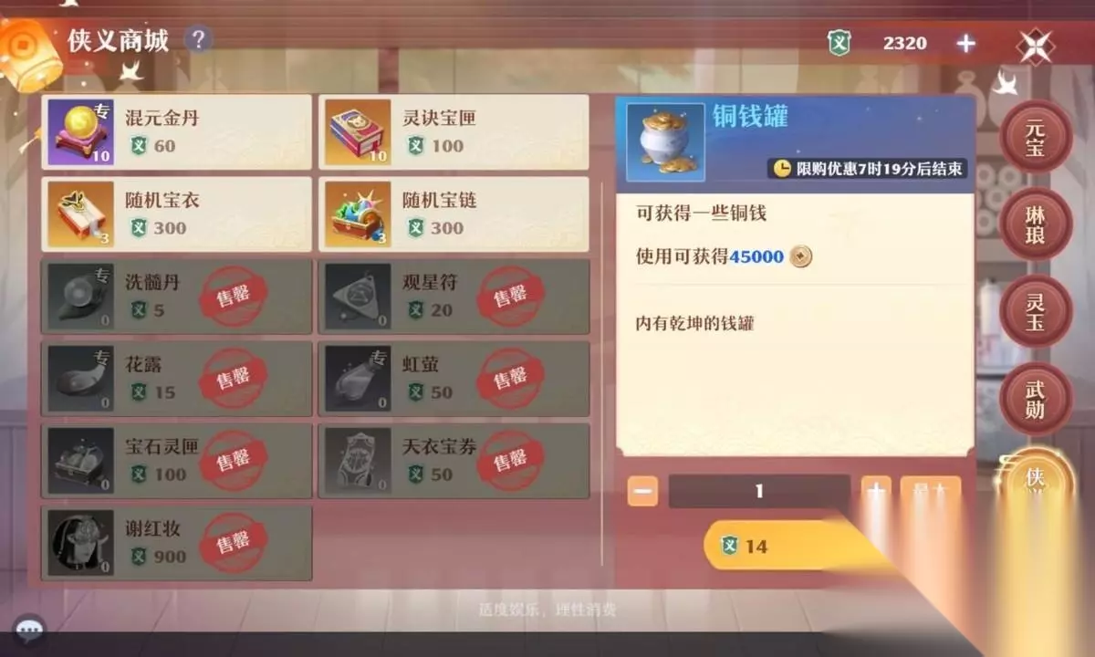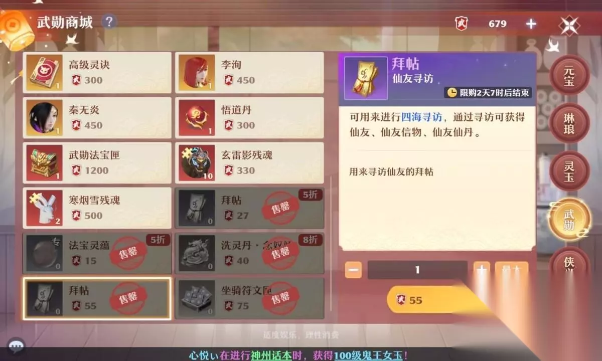 寻访优先使用普通寻访;侠义商城每周谢红妆必须兑换;武勋商城可以根据自己的运气选择兑换拜帖或者两个橙色仙友(每天两张半价必买);仙缘商城优先兑换自己需求阵容的仙友是最佳选择,然后一般为每周的仙友宝箓必买;,新上线的仙友都会在仙缘商城上架1-2周,建议优先兑换。 仙缘商城推荐元宝每周最多重置1次(前提是自己的仙缘足够,氪金可选),因为按照1元宝=200银的兑换比例,如果后期只需要仙游宝禄,兑换第二个仙游宝禄是等值的至13.5+200*200=175000银,第三仙友宝相当于13.5+400*200=215000银,第四仙友宝相当于13.5+600*200=255000银(也可以参考稀有宝商此价格)。 仙友宝箓只建议兑换不参与每周轮换的红色仙友,性价比最高。
