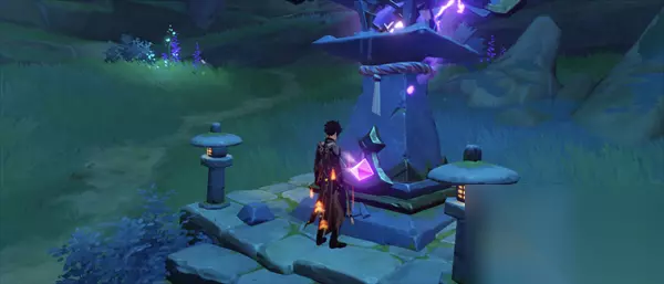 玩家需要破解机关,寻找蛇神之首·磐柱镶珠,蛇神之首·磐柱镇石来修复镇物 其中蛇神之首·磐柱镇石位置如下图所示,跟随元素视野的痕迹,携带雷种子跳下去即可获得