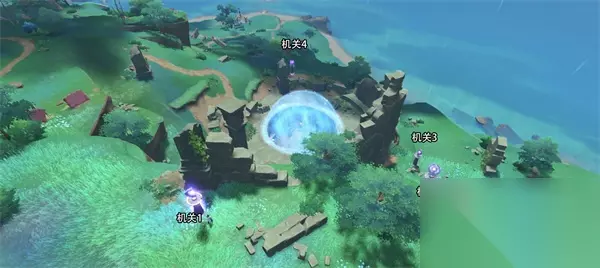 机关1:方向朝向机关2,仰角中 机关2:方向朝向机关3,仰角下 机关3:方向朝向机关4,仰角中 机关4:方向朝向水泡,仰角中 破除机关后,玩家将得到的无想刃狭间·磐柱镶珠,无想刃狭间·磐柱镇石镶入镇物内,即可完成任务。