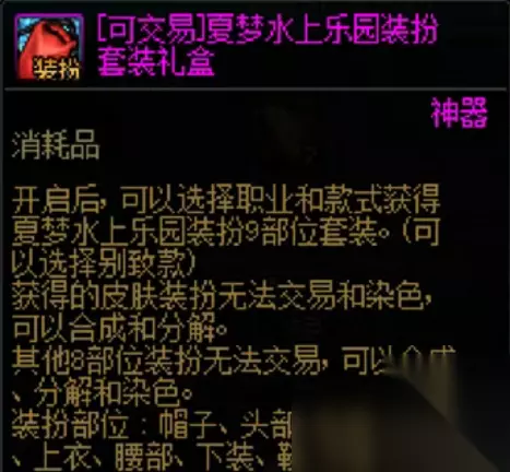 1、夏梦水上乐园装备套装礼盒 在2023夏日活动中,可通过多买多送里面购买夏梦水上乐园装扮套装礼盒,或者通过拍卖购买获得,打开可获得别致款时装;